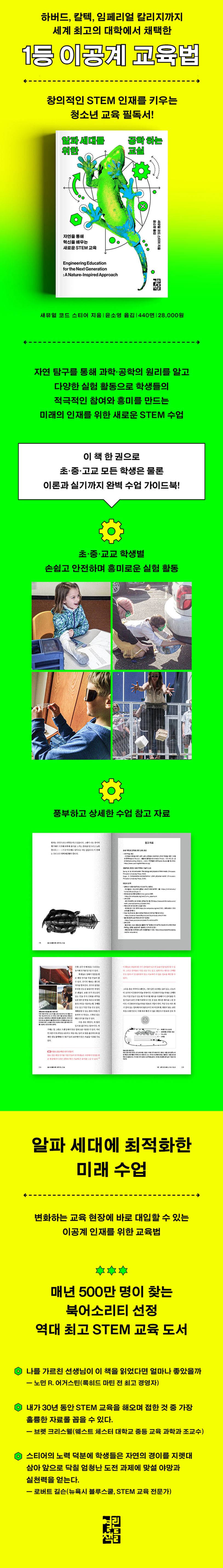 세계 각국의 교육 단체와 최정상 이공계 대학교에서 찾는 교육 컨설팅 전문가 새뮤얼 코드 스티어가 미래의 주류 교육이 될 새로운 이공계 수업 가이드를 한 권의 책으로 완성했다. 그는 현재 시행되고 개발하는 수많은 교육과 교수법 중에서도 〈자연에서 영감을 받은 공학〉이 단연 필수적이라고 말한다. 이 교육법은 자연 속에 숨은 물리 법칙을 이해하고 이를 아이디어로 삼아 주변 세계를 혁신할 수 있는 능력을 길러 줌으로써, 급변하는 미래를 이끌어 갈 인재를 양성해 준다. 스티어는 이론 외에도 학생들의 반응이 좋았던 실기 활동 또한 수록해서, 이 책 한 권만으로도 모든 부분에서 부족함 없는 수업을 할 수 있도록 했다. 초·중·고교 교사는 물론, 미래 교육에 관심 있는 이라면 반드시 탐독해야 할 교육법이다.