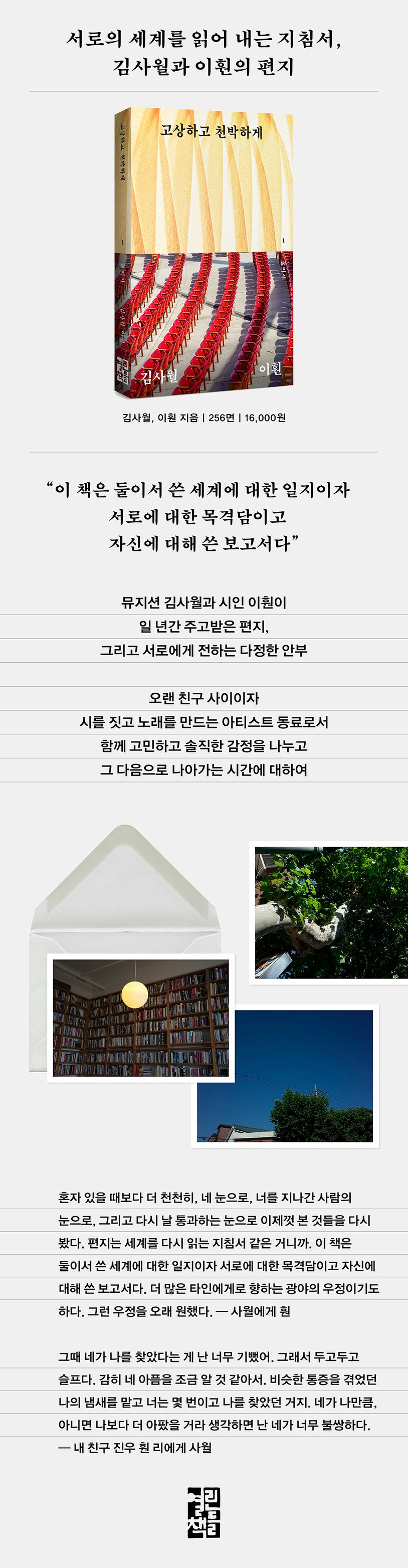두 사람이 함께 쓰는 열린책들의 새로운 에세이 시리즈 〈둘이서〉의 첫 번째 책으로 뮤지션 김사월과 시인 이훤이 일 년간 편지를 주고받은 『고상하고 천박하게』를 선보인다. 책 제목은 김사월의 글 중 〈침실 책상에서는 최대한 고상한 것을, 거실 책상에서는 최대한 천박한 것을〉에서 인용한 것으로, 이렇듯 서로 대조되는 이미지나 시선이 두 사람의 글에서는 자연스럽게 어우러진다. 첫 편지는 2023년 10월로 거슬러 올라가고 마지막 편지는 시작한 지 딱 일 년째인 2024년 10월에 끝이 난다. 오랜 친구 사이인 두 사람은 친구의 남편으로, 아내의 친구로도 만나지만 시를 짓고 노래를 만드는 아티스트 동료로서도 서로 속마음을 터놓고 함께 고민하고 솔직한 감정을 나누고 그다음으로 나아간다.
