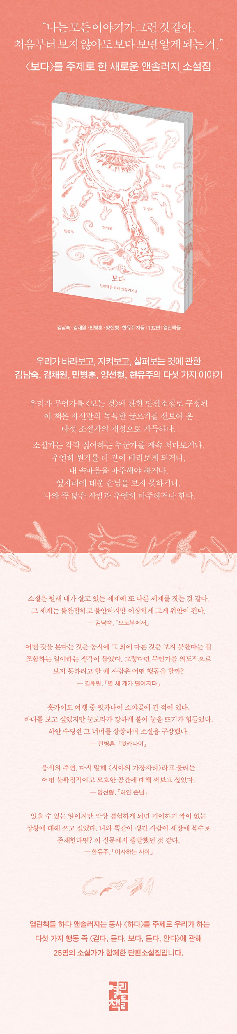 열린책들의 새로운 단편소설집 <하다 앤솔러지>의 세 번째 이야기 『보다』는 소설가 김남숙, 김채원, 민병훈, 양선형, 한유주가 함께한다. 우리가 무언가를 <보는 것>에 관한 단편소설로 구성된 이 책은 자신만의 독특한 글쓰기를 선보여 온 다섯 소설가의 개성으로 가득하다. 오키나와 모토부에서 있었던 일을 떠올리며 한 소설가와 그의 언니에 관한 이야기를 펼치는 김남숙의 「모토부에서」를 시작으로, 할아버지와 손녀들이 함께 바라보게 된 어느 <발>에 관한 김채원의 「별 세 개가 떨어지다」, 누군가의 내밀한 속마음을 세심하게 풀어낸 민병훈의 「왓카나이」, 하얀 손님을 자신의 트럭에 태우게 된 한 운송 기사의 속도감 넘치는 이야기인 양선형의 「하얀 손님」, 내가 이사 나온 집에서 나와 똑 닮은 사람과 마주하게 된 기묘한 경험을 다룬 한유주의 「이사하는 사이」가 차례대로 우리를 기다린다.