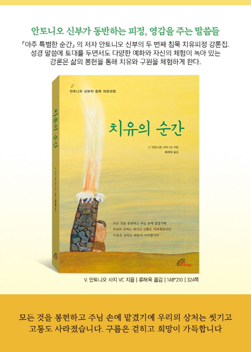 안토니오신부가동반하는피정,영감을주는말씀들6일간의침묵치유피정순서에따른39개의길고짧은강론이고스란히담긴책이다.류해욱신부는옮긴이의말을통해안토니오신부와그의강론이지닌힘을명징하게요약한다.“우리는모두그리스도인이고,성사생활을하고있습니다.하지만뭔지모르게부족한것이느껴집니다.그부족한것을채우기위해저는뭔가를찾고있었습니다.…저는한마디로안토니오신부님에게반했습니다.그가맺고있는성령과의관계가저를매료시켰습니다.그는성령으로가득차있었습니다.…안토니오신부님은우리가어떻게예수님을모실수있는지그방법을알려줍니다.우리는예수님이아닌다른것으로,우리의텅빈부분을채우려하면안됩니다.”(4-5쪽)안토니오신부의강론은성경말씀에토대를두면서도다양한예화와자기신앙체험을진솔하게이야기하고있어서쉽게마음을열고,믿음의삶을성찰하게해주며큰일깨움을만나게해준다.그가이끄는대로성경말씀을따라가다보면어느순간아,그렇구나하는깨달음이온다.안토니오신부는성서학적지식을동원하거나전문적인해설을하지는않지만,그가전하는말씀은큰일깨움과위로,기쁨을가져다준다.그의강론은믿음이스며드는생활,삶의동반자로삼아야할기도생활과죄를직시하고통회와회개의길로나아갈수있도록비춰준다.아울러성사의은총을충만하게누리기위해우리가구체적으로실천할수있는제안도잊지않는다.삶의자리에서주님께드릴선물을준비하며성숙하고충만한신앙의삶으로나아갈수있도록이끈다.개인피정을하거나특별한전례시기에주님과더친밀한관계로나아가고자할때든든한동반자가될것이다.하느님의사랑받는자녀라는확신“하느님사랑을체험하지못하는가장큰이유는믿음이부족하기때문입니다.믿음없이하느님사랑을체험하는것은불가능합니다.”(60쪽)신부님은이렇듯삶의자리를진단하며하느님의사랑은우리가죄인임에도불구하고멈추지않는다는것을성경의인물과성인들의체험,그리고신부님의체험으로녹여낸다.“우리는모두죄인임을인정합니다.그것이바로우리안에성령께서머무신다는표시이지요.…그러나죄책감은지니지마십시오.빛속에서우리자신을있는그대로봅시다.어떤가면도쓰지않고있는그대로우리가누구인지아는것은중요합니다.…우리의목적은슬픔에빠지거나죄책감을느끼는것이아니라,바로날아오르는것입니다.사랑으로돌아오는것입니다.사랑안에서희망을지니고사는것입니다.…인간인저는큰죄를지을수있습니다.그러나자비와사랑의하느님께용서받을수없는죄는없습니다.(125-128쪽)“우리는하느님의그림자입니다.그분의모습을닮은그분의피조물입니다.우리는그분에게소중한존재입니다.설령사람들이우리를쓸모없다고하더라도우리는하느님의아들딸입니다.”(142-143)하느님의자녀다운봉헌물안토니오신부는우리삶의자리,관계가운데제단을마련하라고초대한다.마치아브라함이이사악을봉헌하는자리,요셉성인이임신한마리아를받아들이는자리,그리고예수님이우리를위해마련하신십자가의제단처럼.일상에서만나게되는관계의어려움,고통,이기적경향들을미사때봉헌함으로써주님께의탁하고주님과함께걸어가라는초대이다.“관계에서틈새는왜생기는걸까요?이관계의틈새를메우기위해서어떻게해야할까요?바로제단으로나아가야합니다.제단은희생물을바치는곳입니다.우리는관계에서틈새의원인이되었던것을희생물로바칩니다.”(21쪽)치유와구원의체험“요셉,마리아,예수.우리는그분들의가정을성가정이라고하지요.아주아름다운이름입니다.성가정이라는이름이하늘에서그냥떨어진것이아닙니다.그들은그만한값을치르셨습니다.…세상의눈으로보면요셉은실패자입니다.하지만하느님의눈으로바라볼때그는승리자입니다.세상에서가장축복받은사람입니다.…우리는우리가족을인간적인시각으로만보려고합니다.만일우리가가족을그렇게만본다면우리는실패자일수있겠지요.그러나하느님의시각으로본다면우리가얼마나많은축복을받았는지알수있습니다.(311-314쪽)안토니오신부는이렇듯구체적인삶의자리를하느님의시선으로다시바라보게함으로써그안에존재하는하느님의은총과구원의손길을만나게한다.