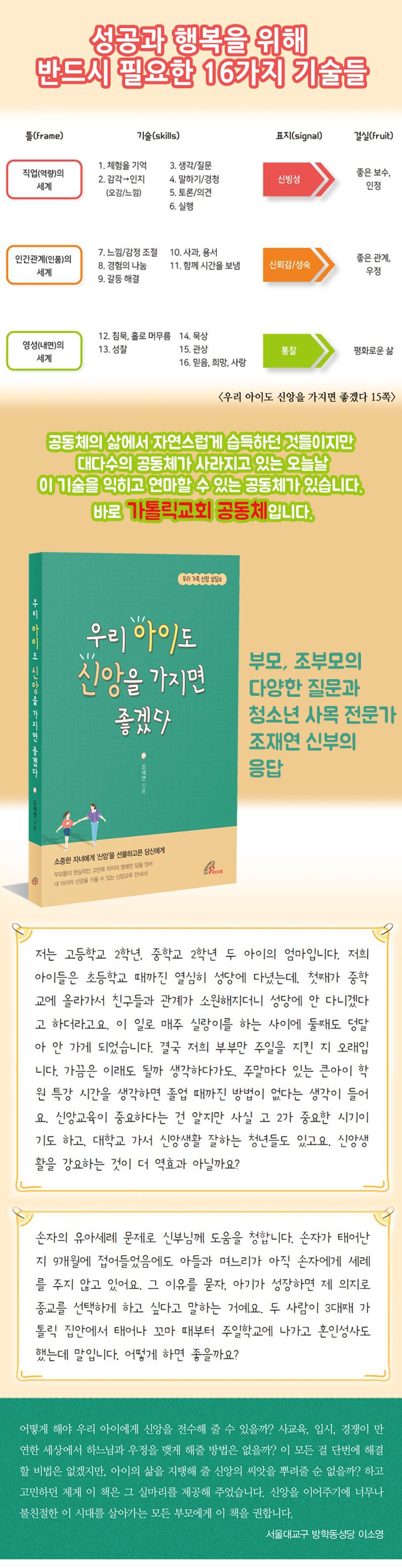 자녀에게신앙을전하고키우도록이끄는신앙교육안내서아이에게신앙을이어주고싶은데마음처럼되지않는수많은문제와걱정을가진부모ㆍ조부모가건넨다양한질문들,이에공감하며적절하게방향을제시하고통찰할수있는새로운시선을열어주는에세이다.「가톨릭신문」에〈내리신앙깊어가는믿음〉이란제목으로연재한내용을정리,보완한것이다.청소년과청년들사목에가정의중요성을공감하는서울대교구장정순택대주교는저자신부가주관하는가정·청소년운동인‘한국키로CHIRO운동’을직접참관한소감까지전하며이책을통해많은가정이하느님안에서사랑의열매를맺기바라는마음으로적극추천하고있다.이책은영·유아,어린이,청소년자녀를둔부모ㆍ조부모라면한번쯤가졌을질문과사연을싣고,그에대한응답형식으로구성되어있기에비슷한고민을하는부모들이방향성을잡아갈수있도록도와준다.3장으로구성되어있으며,각장의내용을요약하면,1장에서는,자녀신앙교육에대해‘교육’이라는언어에갇혀어려움을느끼거나,자신의몫이아니라고여기는부모들을위해‘신앙이어주기’라는새로운용어를제안하고,자녀에게신앙을이어주기위해부모는어떤역할을해야하는지살펴본다.2장에서는,자녀의발달단계에따라가정안에서부모가자녀에게어떻게신앙을이어주면좋을지다양한방법을제시한다.3장에서는,자녀가교회공동체안에서더욱깊이주님을맛들일수있도록가정과교회가어떻게협력하며신앙을이어줄수있을지모색한다.그리고장이끝날때마다내용전체를아우르며각장에서말하고자하는요지를명료하게정리해준다.이책은이미자신안에이어져있는신앙의숨결을감지해보도록초대하며,매일의일상에서그신앙을한올씩감아올려자신과예수그리스도사이를,그리고그리스도와배우자,자녀들,가족들사이를계속해서연결지어나가도록이끈다.그러기에이책은부모의신앙을보듬을뿐만아니라아이의신앙을키워가도록돕는신앙교육안내서다.자녀에게신앙을이어주고싶은부모ㆍ조부모,어린이와청소년ㆍ청년사목,가정사목에관심있는사제,수도자들에게도좋은참고가될것이다.▶표지뒷면에실린추천글-어떻게해야우리아이에게신앙을전수해줄수있을까?사교육,입시,경쟁이만연한세상에서하느님과우정을맺게해줄방법은없을까?이모든걸단번에해결할비법은없겠지만,아이의삶을지탱해줄신앙의씨앗을뿌려줄순없을까?하고고민하던제게이책은그실마리를제공해주었습니다.신앙을이어주기에너무나불친절한이시대를살아가는모든부모에게이책을권합니다.서울대교구방학동성당이소영-조재연신부님의특별한시선과교회의역사에숨어있는사랑의메시지가온갖자녀교육서에서쏟아지는말의홍수속에서흔들리던제마음을다잡을수있게해줍니다.저처럼자녀와함께성장하고있는서툰부모들에게함께읽고나누자고권하고싶습니다.아이에게신앙을전해주는것이부담이아닌축복이라는것을느끼게될것입니다.서울대교구마천동성당박소영-가톨릭교회에남아있는편지들을살피면서,선조들의신앙이내게이어져왔다는데깊은감명을받은적이있습니다.내가받은신앙을우리아이들에게잘이어주고싶다는갈망에휩싸이기도했고요.삶의현장에서부모들의고민에귀기울인조재연신부님의글들이우리의신앙을다음세대에게전하고자하는이들에게걸어갈길을보여주리라믿습니다.「기적의손편지」,「다산의철학」의저자윤성희▶주제분류:가정,교리교육,신앙생활,상담▶대상핵심독자:신앙생활을하는영ㆍ유아,어린이,청소년자녀를둔부모,부모들의갈망과필요를알고그가정을동반하고자하는수도자,사목자확산독자:모든신앙인,구역장,반장,사목위원,교리교사,아이를잘기르고싶은모든이