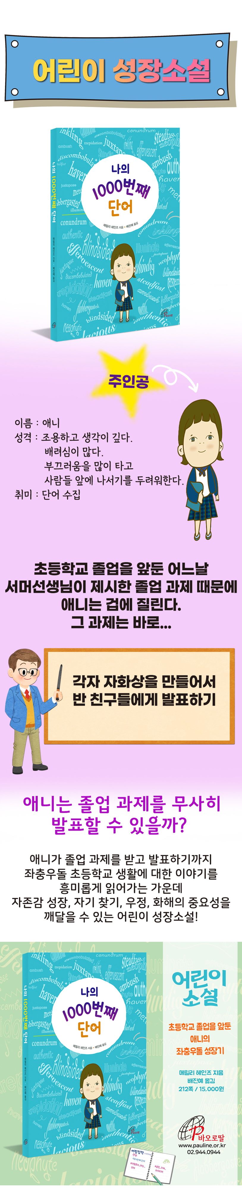나를알고진품인나를발견하는기쁨을얻다이책은단어를수집하는주인공애니의좌충우돌성장기를담은어린이소설이다.주인공애니는초등학교졸업을앞둔조용하고생각이깊으며배려심많은여학생이다.애니의학교에는졸업생들이졸업작품을만드는것으로초등학교생활을마무리하는오랜전통이있는데,올해졸업생은자신을표현해주는무언가를창작하여반아이들앞에서발표해야하는과제를받는다.저마다다른성격을지니고다양한환경에서자란반친구들이자기가어떤사람인지,또어떤사람이되고싶은지소개할과제를준비하는과정이흥미롭게펼쳐진다.아이들은자기가즐기고좋아하는것을찾아내고자신의생각을훌륭하게발표해낸다.이책의소제목은학교과제를수행하는과정에서애니가겪은사건과느낌을표현하는단어들로구성되어있다.독자는애니가겪는일상생활을통해또래아이들의생각을알아차릴수있다.이야기의배경이미국이지만자폐동생이있는친구,이혼가정의친구,경제적어려움을겪는가정의이야기는우리와다르지않다.친구와의관계,이성에대한호기심등도누구나공감이가능하다.이책은자기찾기,화해와용서,자기개방등이자연스럽게스며있는재미있고유익한성장소설이다.책말미에‘이야기나누기’를실어주어자기가무얼잘하고좋아하는지알지못하거나생각하지않고지내는친구들에게자기정체성을발견하도록이끌며지금친구관계로어려움을겪거나자존감이부족한어린이들에게자신을사랑하는법을알려준다.그리고아이들스스로무엇이중요한지질문하도록하여올바른가치관을형성하도록돕는다.또한‘단어모음’에애니가모은단어들을실어주어애니가자신의감정을표현하는언어를어떻게선택하고있는지살펴보면서감정을표현하는단어들을배울수있고,나만의표현방법도찾을수있다.▶뒷표지추천글자신이무엇을좋아하고,무엇을할수있는지알고싶나요?친구관계로어려움을겪고있나요?친구의실수를용서해주는아이들,자기를놀리는아이들에게자기만의방식으로대응하며,자신의보물을찾아가는아이들이여기에있어요.이책은지금친구관계로어려움을겪는여러분에게자신을사랑하는법을알려줄거예요.-대구월배초등학교수석교사이종윤만약에내가주인공애니처럼단어를모은다면,이책을읽고나서‘공감sympathy’이라는단어를수집했을것같다.이책은친구들이공감할수있는이야기를다루어주인공과함께우울하기도했다가뿌듯하기도한감정을느낄수있었다.-불정초등학교6학년홍효린