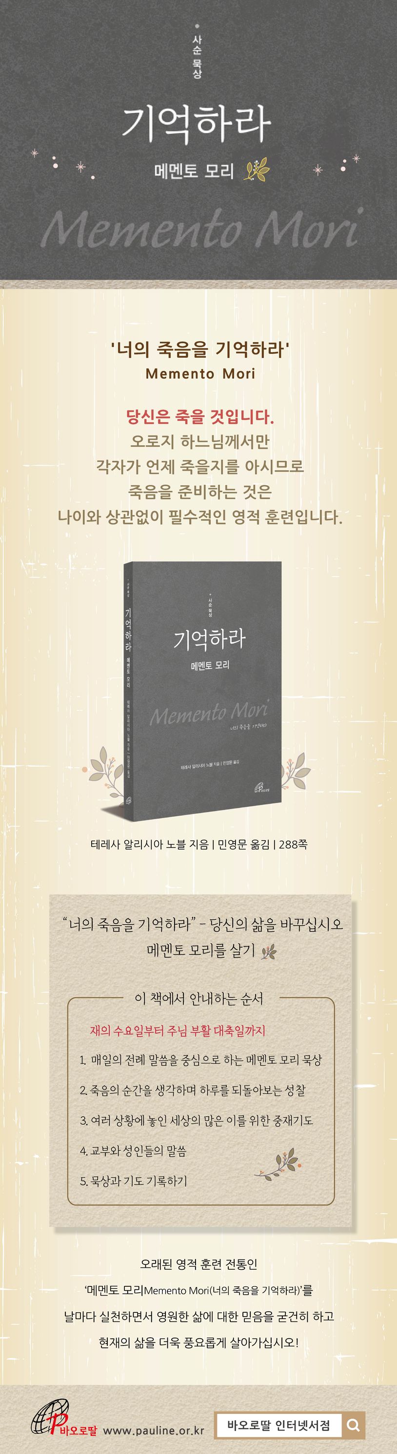 부활신앙을키우고삶을변화시키는영적훈련오래된영적훈련전통인‘메멘토모리MementoMori(너의죽음을기억하라)’를재의수요일부터주님부활대축일까지날마다실천할수있는묵상서다.영원한삶에대한믿음을굳건히하고현재의삶을더욱풍요롭게살도록이끌어준다.날마다묵상의구성은여섯단계로짜여있다.첫째단계는당일전례말씀의성경장절을소개하고,둘째단계에서는묵상을이끌성경구절을인용한다.셋째단계에서는매일의전례말씀을중심으로하는메멘토모리묵상글이주어지고,넷째단계에서는죽음의순간을생각하며하루를되돌아보는성찰과여러상황에놓인세상의많은이를위한중재기도로이어진다.다섯째단계에서는교부들과성인들말씀이주어지고여섯째단계에서는묵상과기도를글이나그림으로기록하도록이끈다.이를통해사순절여정을전례말씀과연결된묵상과기도안에서날마다생의마지막순간의시선으로성찰을훈련하도록동반해준다.이책은영원의지평으로현재의삶을바라보며그리스도를통한구원은총에대한믿음이성장할수있도록안내한다.그러기에개인적으로깊여도좋고공동체와더불어사순절영적프로그램이나피정에도활용할수있다.▶‘메멘토모리MementoMori’란?라틴어로‘너의죽음을기억하라’,‘네가죽는다는것을잊지마라’라는뜻이다.고대로마에서는승리를거두고개선하는장군이시가행진을할때노예를시켜행렬뒤에서“메멘토모리”를외치게했다고전한다.이는개선장군에게겸손해져야한다는것을일깨우는경고장치였다.이문구는삶안에이미들어와있는죽음을의식하고현재삶의참된가치를찾도록교훈을준다.(9쪽)▶뒤표지설명십자가가모든것을변화시킵니다.십자가의승리로,죽음을기억하는것은자신의죽을운명뿐아니라그리스도께서죽음을이기신것을기억하는것도포함합니다.“죽음아,너의승리가어디있느냐?죽음아,너의독침이어디있느냐?”(1코린15,55)그리스도인에게있어죽음을기억하는것은예수님이우리각자를위해하신일을기억하는것과절대분리될수없습니다.예수그리스도의권능안에서그리스도인이메멘토모리를실천하는것은이세상삶의지평을넘어천국의영원한행복에이르게합니다.▶책날개에소개된글“모든언행에서너의마지막때를생각하여라.그러면결코죄를짓지않으리라.”(집회7,36)메멘토모리Mementomori곧“너의죽음을기억하라”는문구는,예측할수도피할수도없는자신의삶의끝을기억하는오래된훈련과관련됩니다.메멘토모리는하느님의은총으로우리의습관을변화시키고거룩하게하는힘이있습니다.메멘토모리는죽음에대한것이라기보다는삶에관한것이라는사실을언제나명심하시기를바랍니다.