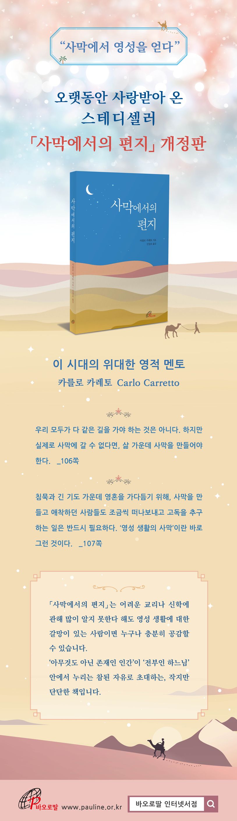 사막에서비추임받은영적체험을나누다하느님의부르심은신비롭다며자신의부르심에대한이야기로문을여는저자카를로카레토.가톨릭운동단체를이끌며이름난활동가로살다가하느님의특별한부르심을받고마흔이넘은나이에홀연히사하라사막으로떠나게된이유를전한다.그리고사막에서10년동안침묵과고독가운데노동과기도에전념하며체험했던바를구체적이고진솔하게들려준다.카를로카레토가첫번째로쓴이책은이탈리아와여러나라에서끊임없이사랑을받는스테디셀러이다.우리나라에서도1976년처음출간된이후많은사람들의마음을사로잡았기에2014년2판을거쳐새로운표지와판형그리고더잘다듬어진본문으로거듭났다.친구와대화를나누듯,사막에서했던다양한체험과그를통해얻은깨달음을가감없이나눈다.아울러신앙생활을하면서한번쯤질문했을‘침묵하시는하느님’에대해,교회의가르침과기도생활에대해누구나충분히공감할수있도록,삶의자리에서흔히범하는오류들에관해서도통찰하며풀어간다.그러기에교리나신학에관해많이알지못해도영성생활에대한갈망이있는사람이면누구나충분히공감할수있다.이책은우리가머무는자리가실제사막이든복잡한현실이든관계없이삶안에하느님을만나는사막의자리를마련할필요성도일깨워준다.또한인간이전부인양여기며지냈던날들에서벗어나라고초대하는가운데,‘아무것도아닌존재인인간’이‘전부인하느님’안에서참된자유를누릴수있다고속삭이며그길을인도해준다.바쁜일상을살기에기도시간이없다고생각하는이들에게,개인피정을하고싶은이들에게좋은안내자가되어준다.**▶뒤표지문구사막에서지나가는낙타를볼때마다복음말씀이떠올라빙그레웃곤한다.“부자가하느님나라에들어가는것보다낙타가바늘구멍으로빠져나가는것이더쉽다.”말이나소를예로들지않고하필이면등에‘혹’이있는낙타를예로드시다니!“사람에게는그것이불가능하지만하느님께는모든것이가능하다.”필요하다면…그분은가난하고병든우리영혼의녹슬고좁은구멍으로낙타가통과하는기적을이루시리라.▶대상핵심독자:영성생활에관심있는이,하느님의부르심에관심있는이,신앙생활을쇄신하고싶은이,영적독서모임을하는이,신학생,수도자,사목자확산독자:가톨릭신자,개신교신자,개신교신학생과사목자,의미있는삶을살고싶은이