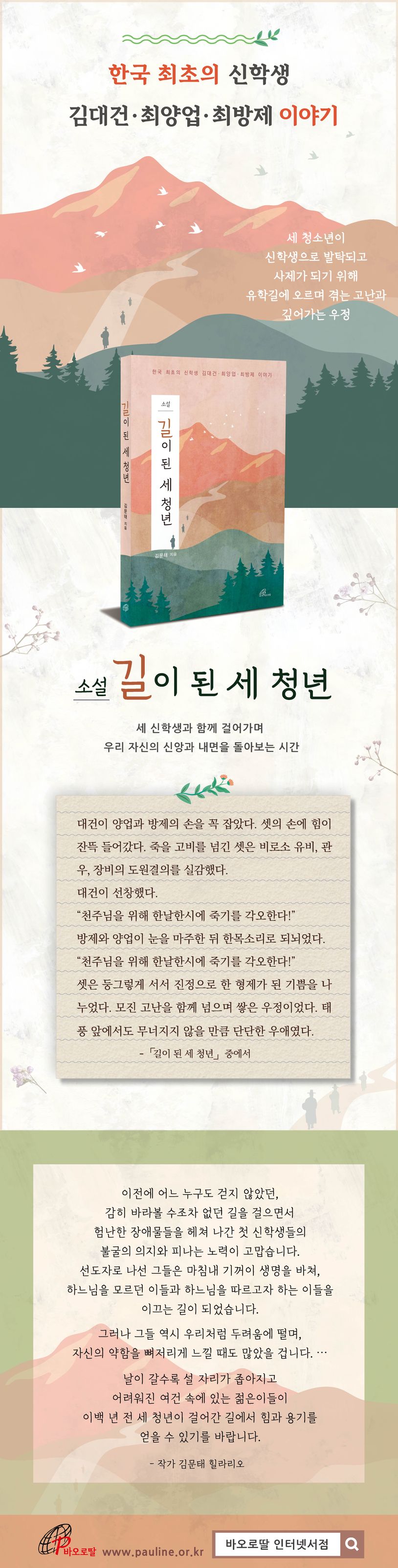 한국 최초의 신학생인 김대건, 최양업, 최방제의 이야기를 담은 소설이다. 초기 한국천주교회 교우들의 삶의 자리에서 시작하여, 부르심에 응답하고 신학 공부를 하러 떠나는 험난한 마카오 유학길과 신학생으로서의 다짐과 우정, 믿음의 길을 담고 있다. 「세 신학생 이야기」(2012)의 개정판이다.