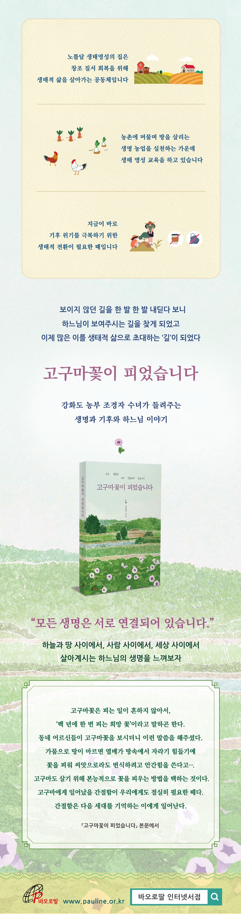 어느 해 심한 가뭄으로 농작물이 타들어 갔을 때, 생전 처음 보는 일이 생겼다. 고구마 줄기에서 보랏빛 꽃이 피어난 것이다. 너무 가물다 보니 땅속에서 열매를 키워내기 힘들어진 고구마가 씨앗으로라도 번식하려 꽃을 피운 것이다. 수녀님은 지금이 우리에게도 이런 생태적 전환이 필요한 때라고 강조한다. 기후변화가 아니라 기후 위기를 겪는 요즈음, 고구마에게 일어났을 간절함이 우리에게도 절실히 필요한 것이다.