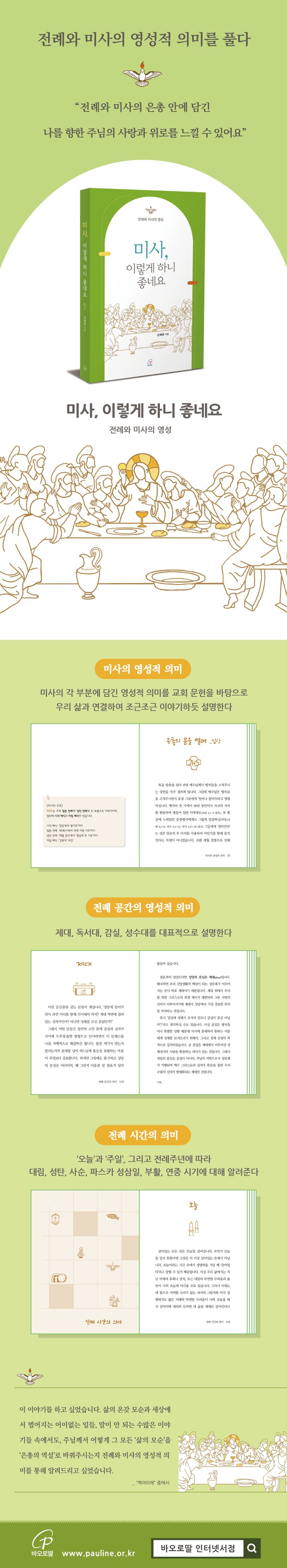 부담되지 않는 길이의 핵심적인 안내를 따라가는 가운데, 전례와 미사의 은총 안에 담긴 나를 향한 주님의 따뜻한 사랑과 위로를 느낄 수 있을 것이다.