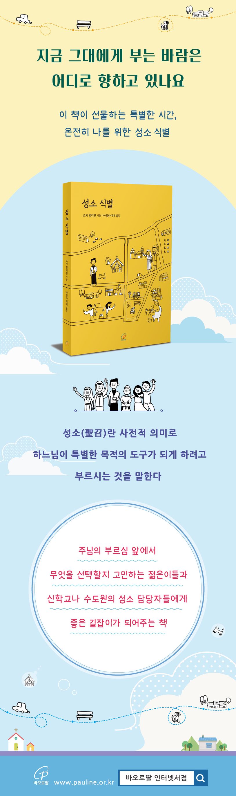 성소 식별은 하느님께서 우리를 위해 마련하신 길을 찾아가며 자유롭게 응답을 드리고 선택하는 과정이다. 이 책은 성소 식별에 필요한 실질적인 안내서로 누구보다 젊은이들이 자신의 삶을 바탕으로 성소를 식별하고 그 성소를 향한 걸음을 걷도록 용기를 준다.