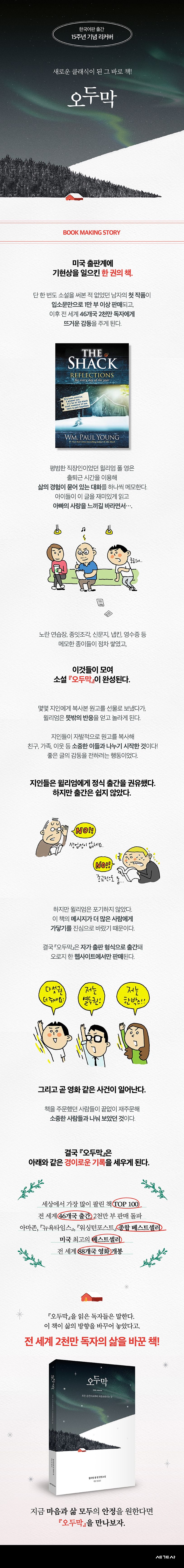 100쇄 기념 리커버 특별판 윌리엄 폴 영의 소설 『오두막』. 이 책의 작가 윌리엄 폴 영은 그의 여섯 자녀에게 줄 크리스마스 선물로 이 책을 썼고, 완성된 초고를 15부 복사해 자녀들, 그리고 친분이 있는 사람들에게 선물했다. 원고를 읽고 감동받은 주변 사람들의 강한 권유로 출판사를 찾기 시작했다. 여러 이유로 원고를 계속 퇴짜를 맞은 폴 영은 평소 친분이 있던 목사 두 명과 함께 2007년 직접 책을 펴냈고, 웹사이트를 열어 책을 판매했다.
