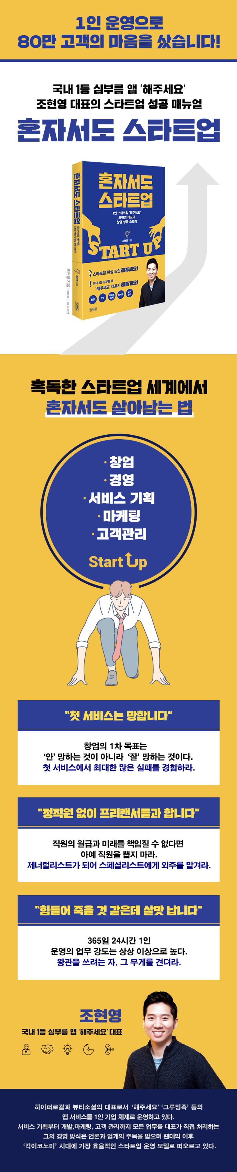신생 IT 스타트업의 90퍼센트가 3년 안에 폐업한다. 몇 개월 수익을 올렸다 사라지는 ‘반짝스타’가 아닌 고객의 일상을 함께하는 ‘유니콘 기업’이 되고 싶다면, 창업자 자신부터 유니콘이 되어야 한다. 여기, 스스로 유니콘이 된 1인 스타트업 대표가 있다. 서비스 기획부터 개발, 마케팅, 고객 관리까지 1인 운영으로 80만 고객의 마음을 사로잡은 국내 1등 심부름 앱 ‘해주세요’의 조현영 대표다. IT 창업을 꿈꾸는 사람들을 위하여 조현영 대표가 직접 해보고 깨달은 1인 기업 운영의 핵심 전략과 수익 모델을 아낌없이 공개한다.