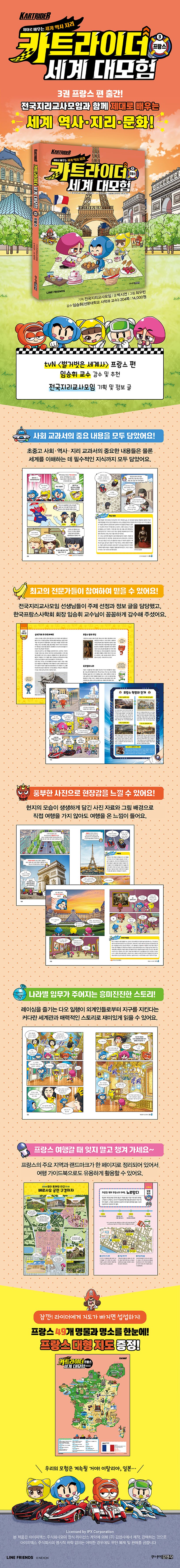 《카트라이더 세계 대모험》 시리즈는 인기 게임 캐릭터와 함께 세계 각국의 역사와 지리, 문화를 알아 가는 학습만화이다. 세계를 무대로 한 다오 일행의 모험을 통해 세계 곳곳의 지리 정보를 현장감 있게 접할 수 있고, 재미있는 스토리 속에서 자연스럽게 세계 역사와 문화에 대한 견문을 넓힐 수 있다. 아이들이 궁금해하는 각 나라의 랜드마크나 문화에 대한 기초적인 상식부터 그 나라의 깊은 역사를 이해하기 위해 꼭 알아야 하는 정보까지 꾹꾹 눌러 담았다. 초중고 사회/역사/지리 교과서 속 중요한 내용을 담아 교과 연계와 선행 학습이 가능하고, 전국지리교사모임 선생님들의 기획 및 정보 글 집필, 프랑스사 전공 교수님의 감수로 정보의 깊이를 더하였다.