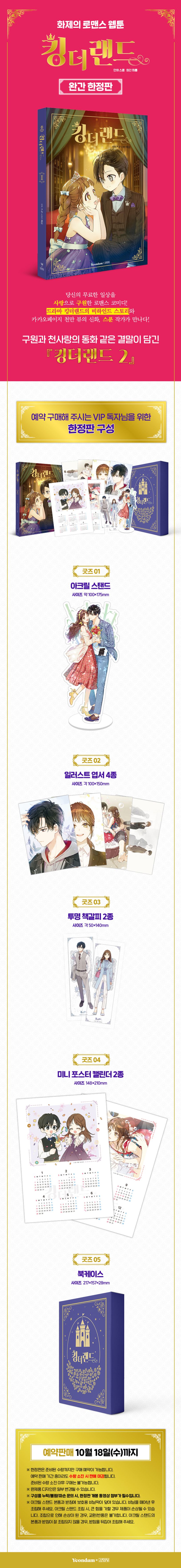 화려하고 감각적인 그림체로 많은 독자들에게 큰 사랑을 받으며 카카오페이지 천만 뷰를 만들어낸 스푼 작가의 신작 〈킹더랜드〉 마지막 이야기가 한정판으로 출간되었다. 웹툰 〈킹더랜드〉는 웃음을 싫어하는 구원과 밝은 웃음의 소유자 천사랑의 로맨스를 담은 작품으로 평점 9.9점을 기록하며 화제성과 작품성 모두 인정받았다. 웹툰 〈킹더랜드〉의 완결이 담긴 《킹더랜드 2》한정판 세트는 성인이 된 구원과 천사랑을 중심으로 다양한 굿즈를 준비하였다. 특히 성인 버전 아크릴 스탠드는 스푼 작가의 미공개 일러스트로 1권 한정판 구성이었던 어린 구원과 천사랑 아크릴 스탠드와 대비될 수 있도록 기존 사이즈보다 크게 제작하였다. 또한 구원과 천사랑 캐릭터를 활용한 투명 책갈피 세트와 2024년 미니 포스터 달력 2종, 엽서 4종 세트, 북 케이스를 구성하여 한정판의 소장 가치를 높였다.