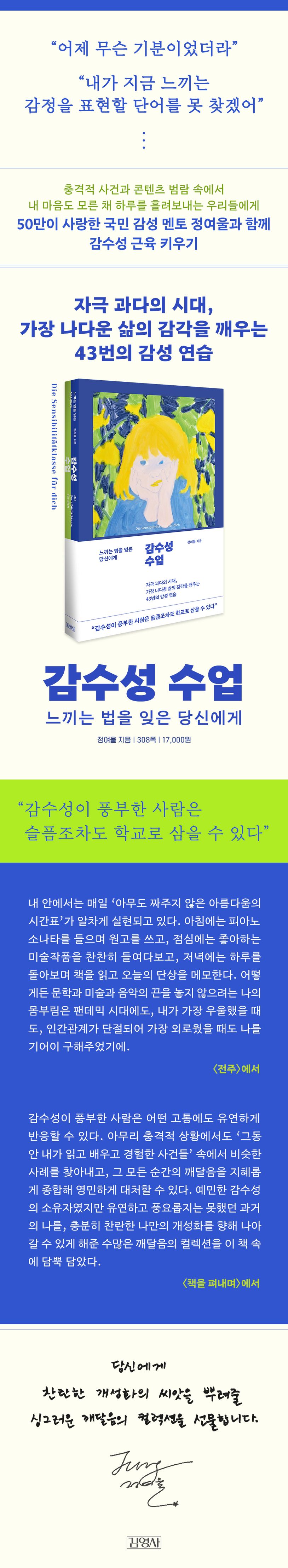 미디어는 연일 충격적 사건을 보도하고, 온라인과 오프라인을 막론해 온갖 콘텐츠를 쏟아내는 자극 과다의 시대다. 부정적 자극 속에서 우리는 내 느낌을 잃어가고 있다. 어제 어떤 기분이었는지 기억나지 않는다면, 지금 느끼는 감정을 표현할 단어를 찾기 힘들다면, 당신에게도 감수성 훈련이 필요하다.