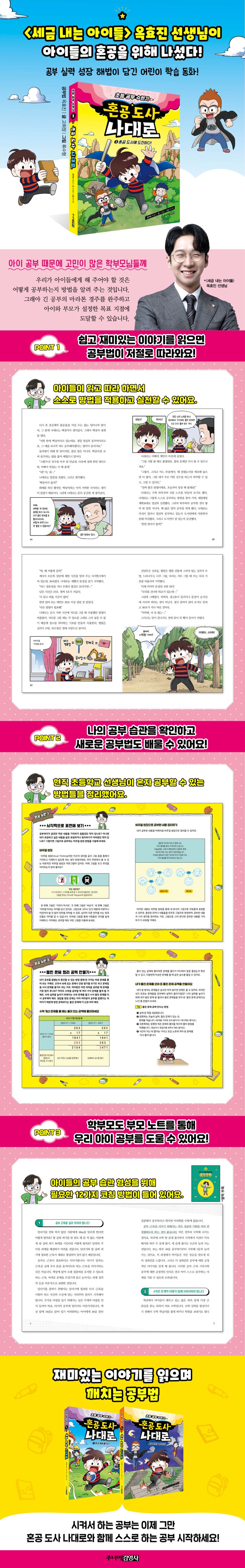 《혼공 도사 나대로》는 스스로 하는 공부의 중요성과 효과적인 공부 방법을 배울 수 있는 어린이 학습 동화 시리즈이다. 13년간 교육 현장에서 아이들과 함께한 옥효진 선생님이 직접 공부법과 학습 내용을 정리하였고, 이를 바탕으로 재미있는 공부 수련기로 이야기 풀어서 읽으면 저절로 공부 방법을 깨칠 수 있게 했다. 3권에는 ‘배움 공책 만들기’, ‘틀린 문제 정리 공책 만들기’ 등 공부 실력 성장을 돕는 해법이 담겨 있어 아이들의 성적 향상에도 도움이 될 것이다. 또한 아이와 함께 학습 시기를 보내는 학부모를 위한 12가지 코칭 방법도 별책 부록으로 제공한다.