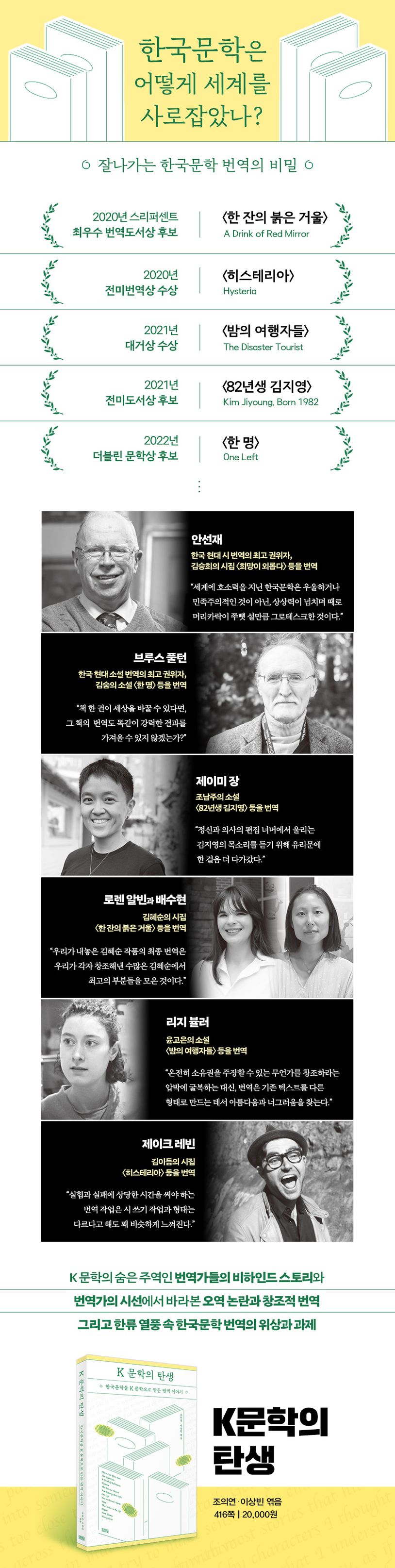 세계 속 한국문학의 위상을 높인 번역 이야기. 한국 현대 시 번역의 최고 권위자 안선재와 한국 현대 소설 번역의 최고 권위자 브루스 풀턴을 비롯하여 조남주의 소설 《82년생 김지영》 등을 번역한 제이미 장, 김혜순의 시집 《한 잔의 붉은 거울》 등을 번역한 로렌 알빈과 배수현, 윤고은의 소설 《밤의 여행자들》 등을 번역한 리지 뷸러, 김이듬의 시집 《히스테리아》 등을 번역한 제이크 레빈 등 해외 주요 문학상 후보에 오르고 또 수상하며 한국문학을 세계에 알린 번역가들의 진솔하고 진지한 이야기가 펼쳐진다.