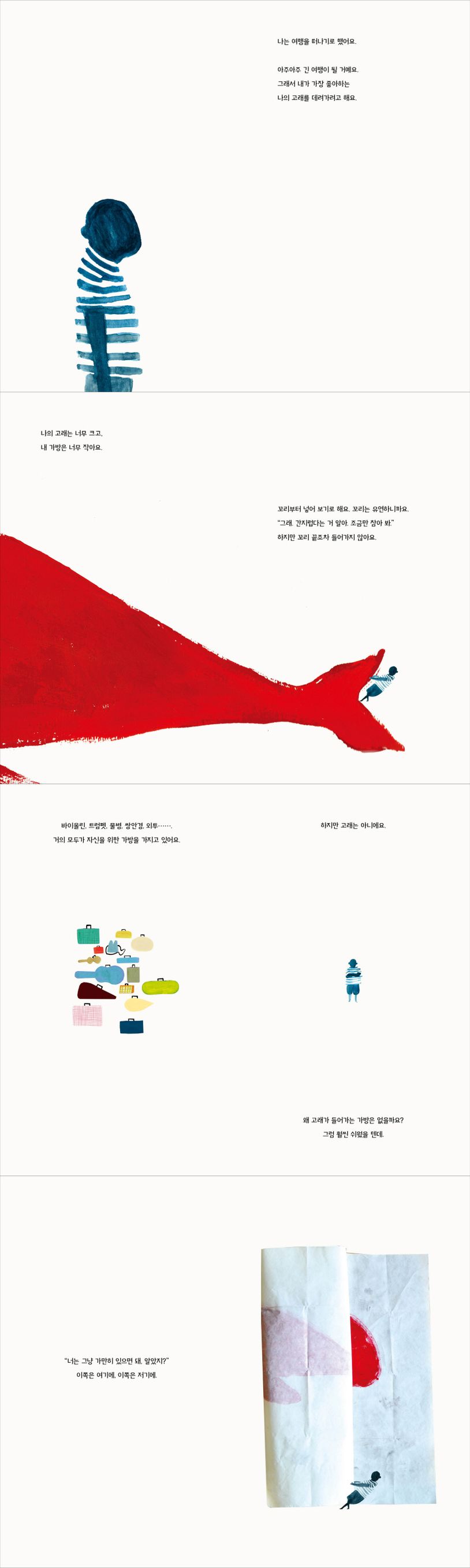 어느 날 갑자기 자그마한 여행 가방만을 들고 떠나게 된 아이. 아이의 이야기를 통해 ‘자신에게 가장 소중한 것’은 무엇인지, 그 소중한 것을 어떤 가방에 어떻게 담아야 할지 생각해 보게 하는 그림책.