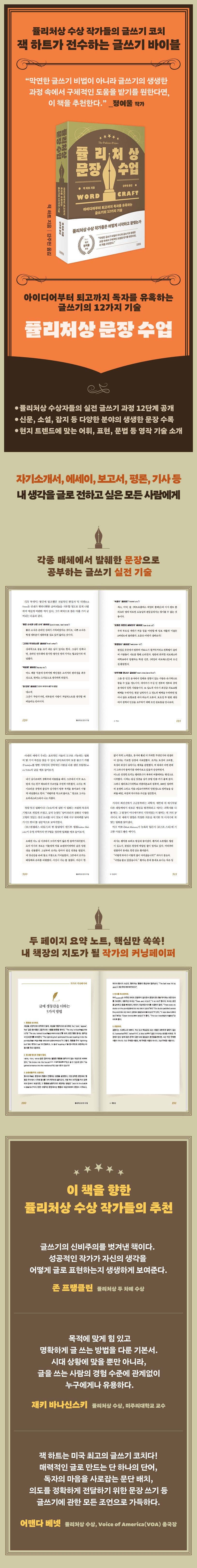 글 잘 쓰는 사람들의 공통점은 무엇일까? 그들은 천부적인 재능을 가지고 태어난 소수 집단이 아니라 묵묵히 한 줄을 쓰고 또 한 줄을 쓰는 노력가라는 것이 전설적인 글쓰기 코치 잭 하트의 답이다. 퓰리처상 수상자들을 다수 길러내며 논픽션 분야의 글쓰기 마스터로 명성을 쌓은 저자는 좋은 글에는 장르를 불문한 원칙이 있다는 사실을 깨우쳤다. 좋은 글은 생동감으로 번뜩이고, 핵심을 정확히 찌르며, 개성이 있다. 이러한 좋은 글의 원칙을 바탕으로 아이디어부터 퇴고까지 글쓰기의 전 과정을 12단계로 나누어 핵심 기술을 생생하게 알려준다. 1부는 글쓰기를 시작하고 끝내는 방법을, 2부는 문장과 표현을 다듬어 완성도를 높이는 실전 기술을 담았다. 장르와 플랫폼에 상관없이 자신의 생각을 글로 전하고 싶은 모든 독자들을 위해 쓰였다.