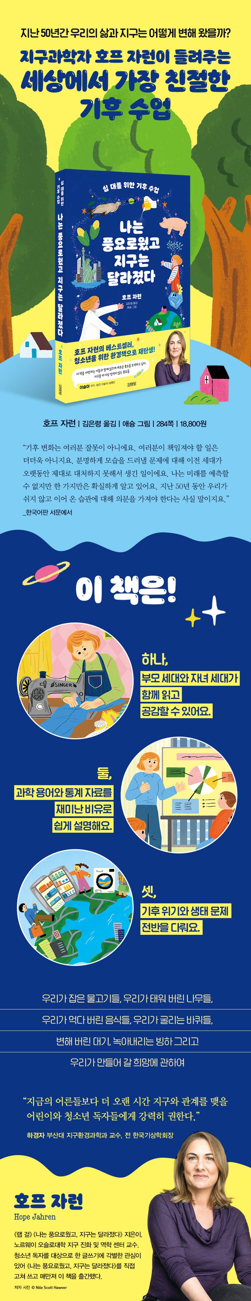 지난 50년간 우리의 삶과 지구는 어떻게 변해 왔을까? 《랩 걸》《나는 풍요로웠고, 지구는 달라졌다》로 전 세계 독자들에게 큰 사랑을 받은 호프 자런이 ‘세상에서 가장 친절한 기후 수업’이라는 타이틀을 내건 신간을 들고 독자들을 찾는다. 제목은 《십 대를 위한 기후 수업, 나는 풍요로웠고 지구는 달라졌다》. 앞서 성인 독자를 대상으로 집필했던 《나는 풍요로웠고, 지구는 달라졌다》를 십 대 독자들의 눈높이에 맞추어 호프 자런이 직접 다듬어 출간한 것이다. 이번 신간은 기존 원고를 청소년들이 더 수월하게 접할 수 있도록 편집하여 쉽게 풀어 썼고, 특히 한국어판에는 인기 일러스트레이터 애슝의 그림을 실었다. 많은 청소년 독자들이 이 책을 통해 우리 사회가 마주한 기후·생태 위기를 보다 폭넓게 이해하고, 세상을 바꾸기 위한 변화가 왜 필요한지 깊이 공감할 수 있을 것이다.