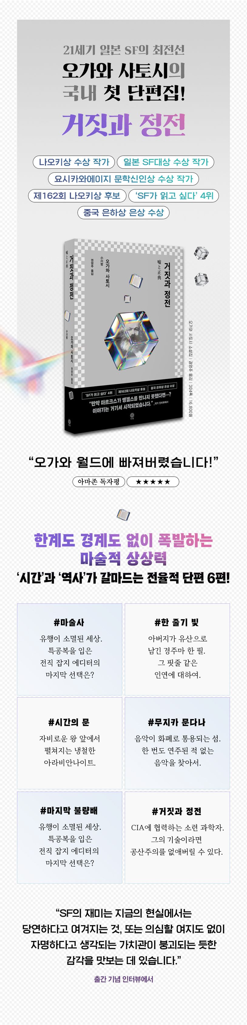 도쿄 대학원 재학중에 하야카와 SF콘테스트 대상으로 데뷔한 이래, 단 다섯 작품으로 유수의 문학상을 석권하며 천재적 작가가 등장했음을 당당히 알린 오가와 사토시. 작품마다 파격적이고도 정치한 상상력으로 전 열도를 전율시키며 일본 SF계, 나아가 일본 문단을 대표하는 작가로 급부상한 그가 첫 번째 SF 단편집 《거짓과 정전》을 선보인다.