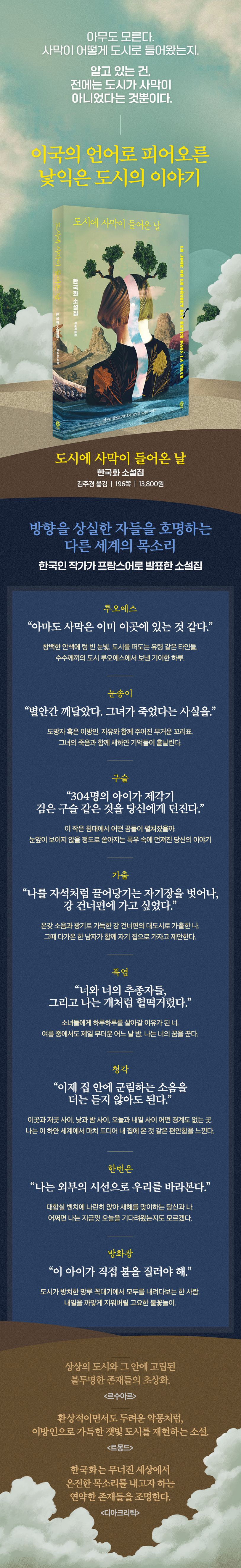 “상상의 도시와 그 안에 고립된 불투명한 존재들의 초상화”라는 평을 받으며 2020년 프랑스 문단에 화려하게 데뷔한 한국화. 같은 해 일본에서도 출간되어 “간결한 문체로 풍부한 이미지를 그려내 폭넓은 상상력을 자극하는 소설” 등으로 화제를 모은 그의 작품집 《도시에 사막이 들어온 날》이 드디어 한국 독자를 만난다. 서울의 영문 표기를 거꾸로 배열한 이름의 도시를 그린 소설 〈루오에스〉를 비롯해 〈눈송이〉 〈구슬〉 등 총 8편의 단편소설을 담았다.