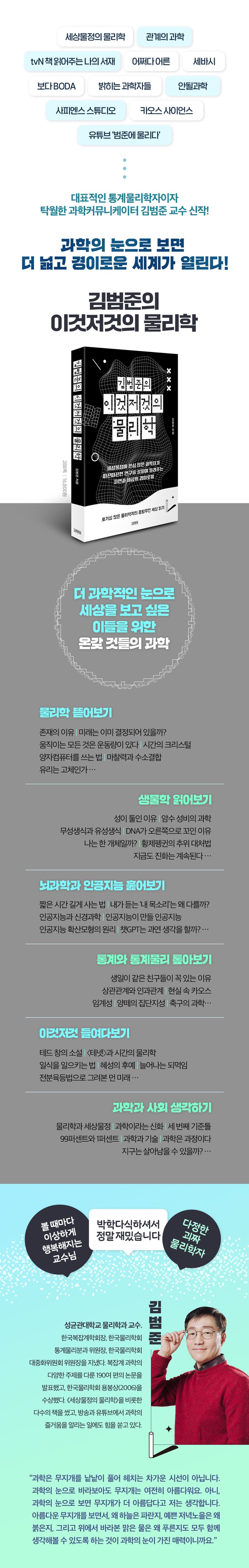 XX, XY 말고 YY 염색체는 왜 없을까? 손가락에 침을 묻히면 책장이 잘 넘어가는 까닭은? 챗GPT는 과연 생각을 할까? 우리가 존재하게 된 과학적인 이유는? 미래는 이미 결정되어 있을까? … 세상의 온갖 것들이 궁금한 호기심 가득한 물리학자가 과학의 창으로 들여다본 경이로운 세상의 모습을 담은 책. 우리나라의 대표적인 통계물리학자이자 탁월한 과학커뮤니케이터인 성균관대학교 김범준 교수가 물리학에서 생물학, 신경과학, 인공지능까지 다양한 분야의 최신 연구를 소개하면서, 과학의 매력과 과학적 탐구의 즐거움을 보여준다.