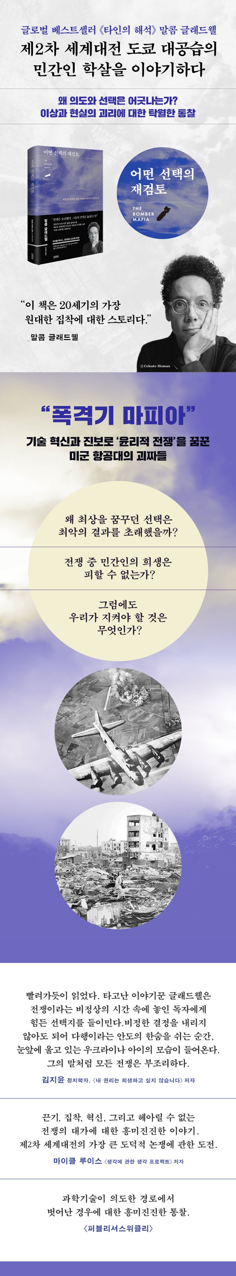 하룻밤에 10만 명의 사망자를 낸 도쿄 대공습이 실은 더 많은 목숨을 살리려는 의도에서 벌어진 일이라면? 《어떤 선택의 재검토》에서 말콤 글래드웰은 미군 지휘부가 도쿄 대공습을 결정하기까지 과정을 추적하면서 이상과 현실, 의도와 선택의 괴리를 보여준다. 폭격기 마피아가 꿈꾼 ‘윤리적 전쟁’은 존재하는가? 왜 의도와 선택은 어긋나는가? 어느 때보다 올바른 선택이 무엇인지를 고민해야 할 지금, 뜨거운 화두를 던져줄 흥미진진한 책이다.