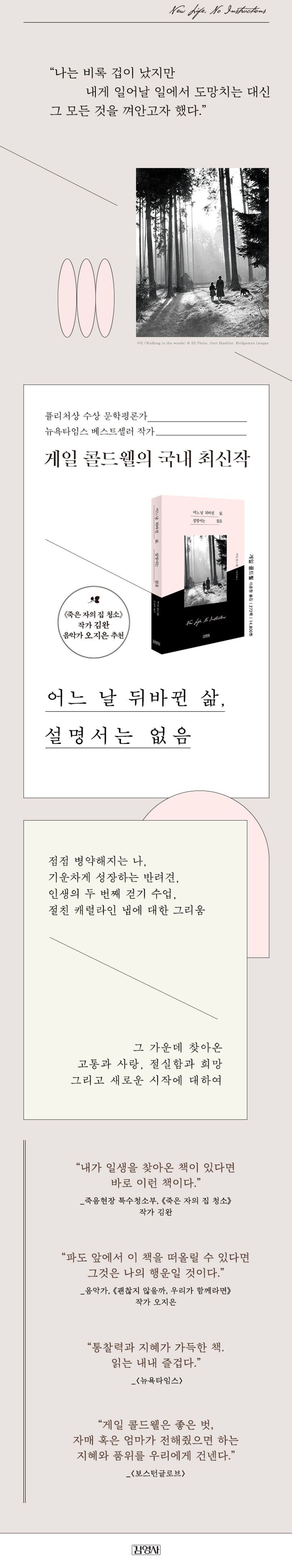 사는 게 쉽지 않다고 느낄 때, 사랑하는 관계에서 기쁨과 고통을 동시에 느껴 혼란스러울 때, 《어느 날 뒤바뀐 삶, 설명서는 없음》을 읽어보자. 좋은 책이 줄 수 있는 위로와 즐거움을 맘껏 누릴 수 있다. 게일 콜드웰과 캐럴라인 냅의 책을 접했던 독자는 물론, 문학성 있는 에세이를 즐기는 독자가 사랑하게 될 책이다.