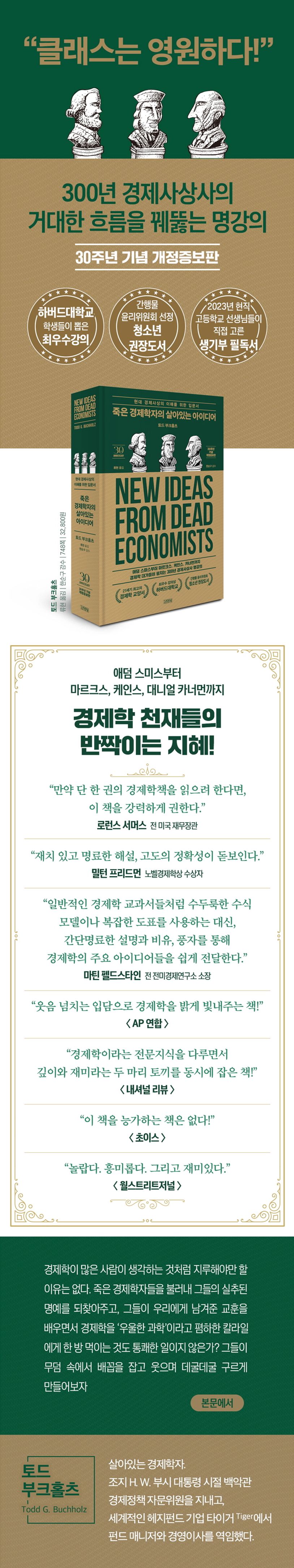 21세기 최고의 경제학 교양서가 최신 개정판으로 돌아왔다. 애덤 스미스의 국부론부터 맬서스의 인구론, 마셜의 수요공급 곡선, 루카스의 합리적 기대이론, 대니얼 카너먼의 행동경제학까지. 300년 경제학 역사를 이끌어온 거장들의 사상을 한 권에 담은 가장 쉽고 권위 있는 경제학 교과서로 “깊이와 재미를 동시에 잡은 책”이라는 호평을 받으며 전 세계 경제학자, 대학생, 청소년의 필독서로 자리 잡았다. 죽은 경제학자들의 여전히 살아있는 아이디어에서 더 풍요로운 미래를 위한 활로를 찾아보자.