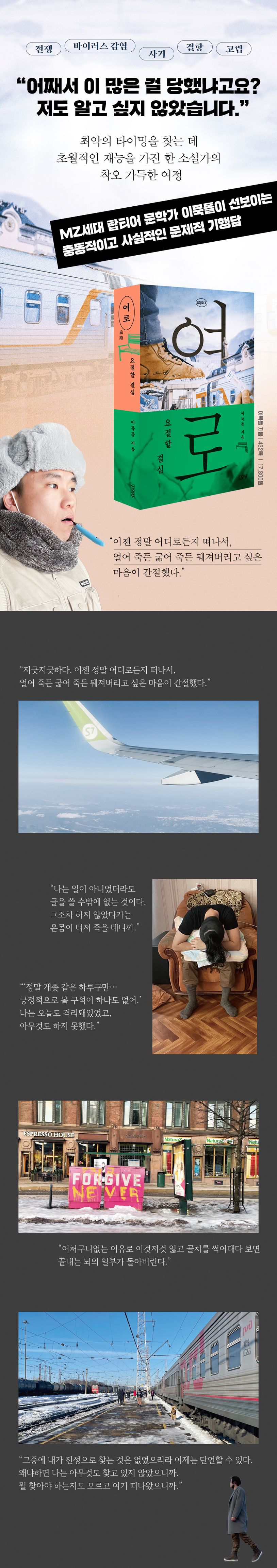 독특한 주제 선정과 감각적인 표현으로 큰 사랑을 받아온 이묵돌 작가가 착오 가득했던 여정을 마치고 독자 앞에 섰다. 작가는 어느 날 문득, 반복되는 일상, 기계적인 마감, 나아지지 않는 경제 형편, 바이러스로부터 받는 구속 등 지난한 일상의 지속을 감당하지 못하고 어디로든지 떠나고 싶은 강력한 충동에 사로잡힌다. 황량하고 광막한 곳에서 홀로 생을 마감하리라 다짐하면서 시베리아 횡단열차에 오른다. 하지만 떠나온 곳에서조차 모든 일은 그의 뜻대로 풀리지 않고 사기, 전쟁 발발, 바이러스 감염, 격리, 결항 등 일생에 한 번도 겪기 어려운 일들을 모조리 경험하게 된다. 역마살이 가득한 사주, 객사할 팔자를 타고났다는 작가는 과연 ‘요절할 결심’을 끝내 이룰 수 있을 것인가.