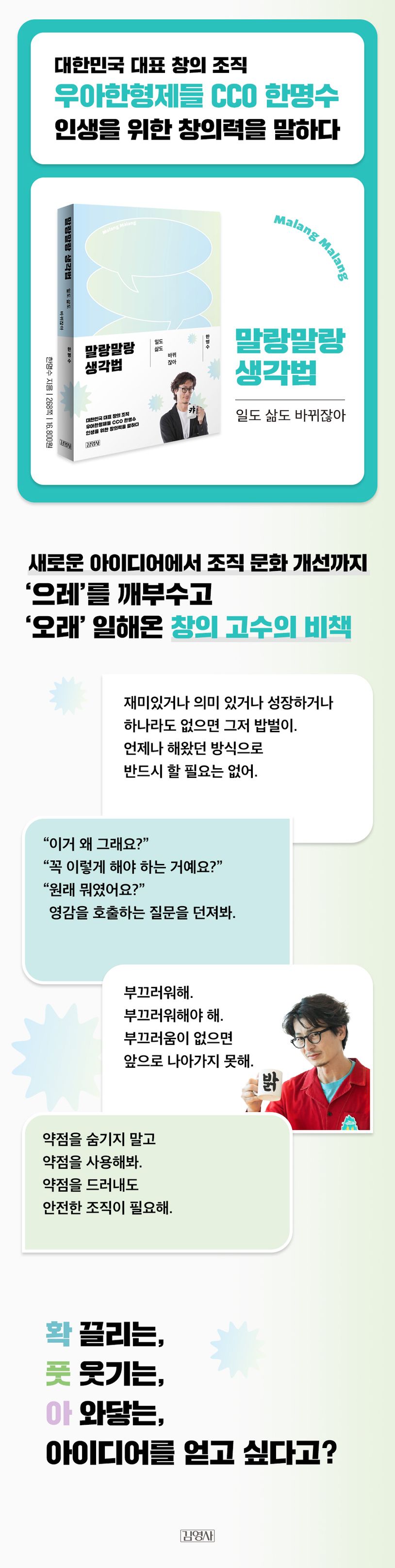 이런 이야기가 담긴 책 《말랑말랑 생각법》은 배달의민족 서비스뿐 아니라 한글 서체 개발에서 우아한형제들 조직 문화 개선까지 책임지고 일해온 한명수 CCO(Chief Creative Officer)의 업력과 공력이 담긴 책입니다. 창의력이란 단어만 들어도 창의력이 사라지는 여러분께, 먹고사는 데 도움이 되는 창의력이 무엇인지 알려줍니다. ‘으레’를 깨부수고 ‘오래’ 일해온 그가 새로운 아이디어를 얻는 법에서 일터에 유쾌함과 즐거움을 불어넣는 법까지 입체적인 사례를 들어 소개하지요. “조직 문화가 돈이 되지!” “망가뜨려, 더 망가뜨려!” “부끄러워해야 해. 부끄러움이 없으면 나아가지 못해.” 감히 말하건대 이 책으로 여러분의 일도 삶도 은근히 바뀌고 낭창해질 것입니다.