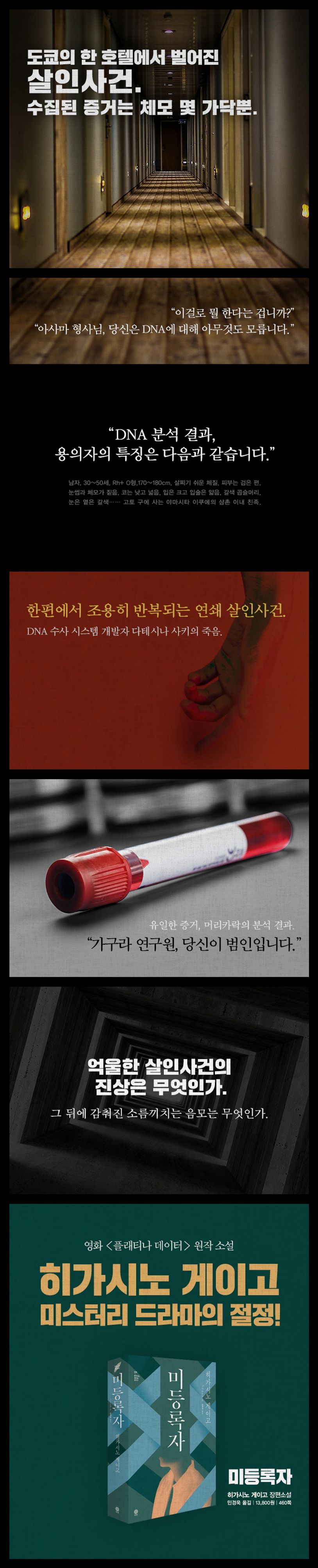 국가가 검거율 백 퍼센트를 표방하며 국민의 DNA 정보를 수집한다는 근미래를 배경으로 과학과 기술이 특정 목적을 위해 오용된다면 얼마나 무서운 흉기로 돌변하는지에 대해 묵직한 메시지를 전하는 『미등록자』. 일본의 인기 아이돌 아라시의 니노미야 가즈나리 주연 《플래티나 데이터》로 영화화되었던 작품으로 2018년 오늘의 독자를 위해, 작가와의 면밀한 상의 끝에 한국어판 제목을 새로 붙여 선보이게 되었다. 공학 전공자 히가시노 게이고의 깊이 있는 지식과 경계 없는 상상력이 유감없이 발휘된다.