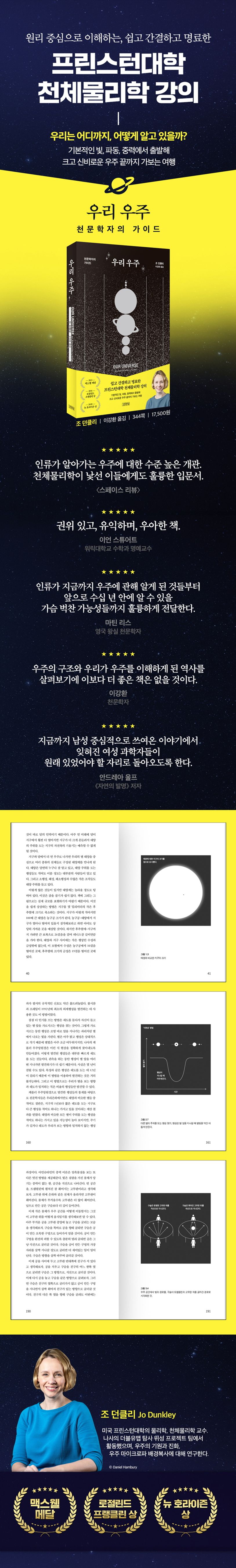 권위 있는 물리학 상을 여럿 수상한, 프린스턴대학 물리학·천체물리학과 교수 조 던클리의 천문학 입문 강의. 그는 사실을 과장하거나 어떤 느낌을 강요하지 않고, 군더더기 없이 핵심을 파고드는 설명을 통해 청중을 감탄하게 만드는 강연을 하는 것으로 유명하다. 화려한 시청각 자료보다 일상에서 볼 수 있는 사물을 들어 보이면서 우주가 움직이는 원리를 이해하게 만들기 때문에, 독자들은 마치 한 분야에 정통한 대가가 분필 하나를 잡고 넓디넓은 우주를 상상하게 만드는 수업에 참여하는 듯한 기분을 느낄 것이다. 그는 우주를 이해하기 위해 필수적인 물리·화학·수학 지식을 쏙쏙 뽑아내 먼저 소개하고 천체를 우리가 쉽게 이해할 수 있는 휴먼스케일의 사물에 비유하기도 하면서 우주적 현상을 탁월하게 설명해내며, 42장의 군더더기 없는 2차원 도판이 더욱 효과적으로 그 이해를 돕는다. 즉 이것은 권위와 품위를 잃지 않으면서 과학적 발견의 두근거림과 공감을 불러일으키는, 원리 중심의 천문학 책이다.