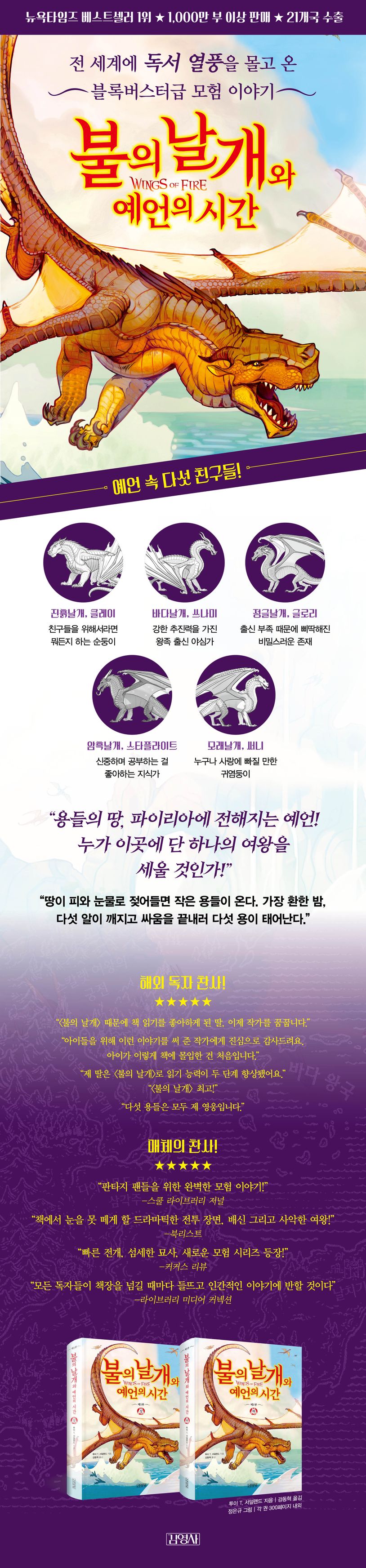 태어나서부터 한 번도 동굴 밖에 나가 본 적이 없는 클레이, 써니, 쓰나미, 스타플라이트, 글로리. 다섯 용은 온종일 전투 훈련을 받고 역사와 신화를 공부하는 게 생활의 전부다. 태양이 어떤 빛을 띠고 있는지, 가족이 뭔지는 모두 두루마리를 통해서 배울 뿐이다. 세 명의 보호자는 그들을 가둬 두고 가혹하게 훈련시킨다. 언젠가 때가 되면 ‘평화의 발톱’이 그들을 찾으러 올 거라고 말하면서.
