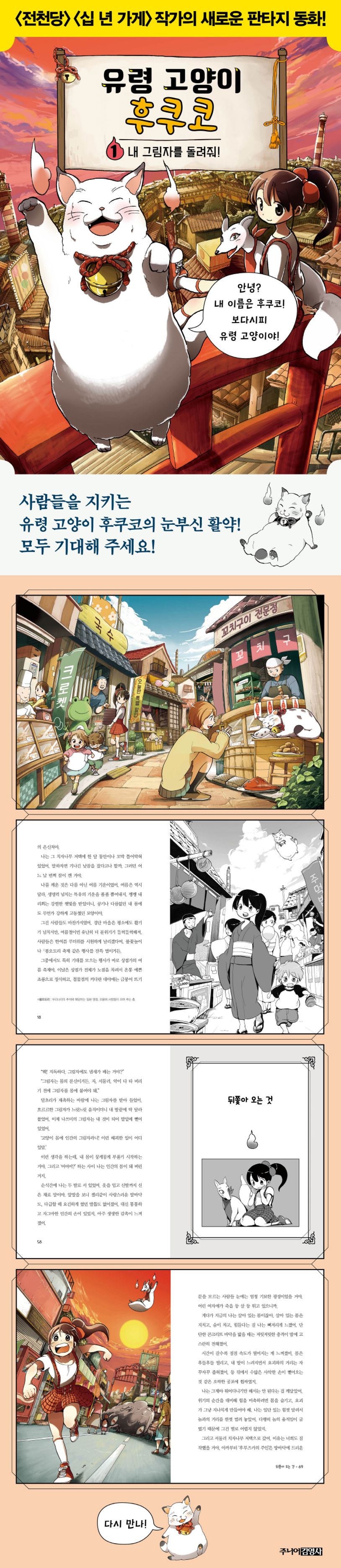 〈전천당〉 시리즈 히로시마 레이코 작가가 선보이는 새로운 판타지 동화이다. 온 마을의 귀염둥이로 사랑받던 고양이 후쿠코는 갑작스러운 사고로 목숨을 잃고. 하루아침에 유령 고양이가 된다. 하지만 어찌 된 영문인지 후쿠코는 저세상으로 떠나지 않고 마을에 계속 남게 되고, 여우 신령 달초리를 만나게 된다. 성질 급한 후쿠코와 잔꾀 많은 달초리는 사사건건 부딪치며 자주 다투지만, 위험에 빠진 사람을 구하는 일에는 서로 힘을 모은다.