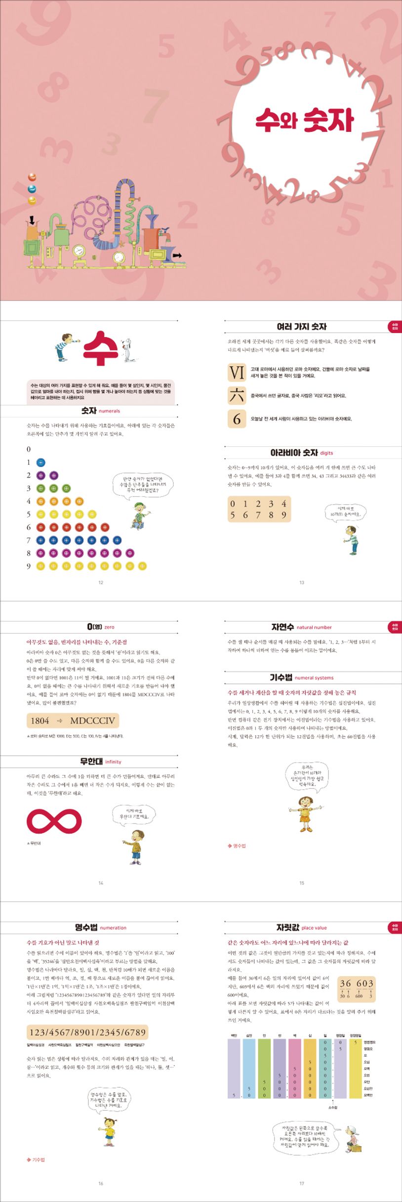 《교과서 옆 개념 잡는 초등수학 사전》은 일반적인 사전과 달리 가나다순이 아닌, 사전의 특징을 살리되 수학 교과의 특성에 맞고 학교 공부와 쉽게 연계해 활용할 수 있도록, 용어를 수학의 영역별로 구분했다. 각 용어 아래에는 연관되는 용어까지 표시해 두어 수학 개념을 유기적으로 이해할 수 있도록 했다. 또한 책 뒤쪽에는 ‘ㄱㄴㄷ 순서로 찾아보기’가 들어 있어 가나다순의 일반 사전처럼 수학 용어를 찾아보는 것도 가능하다.