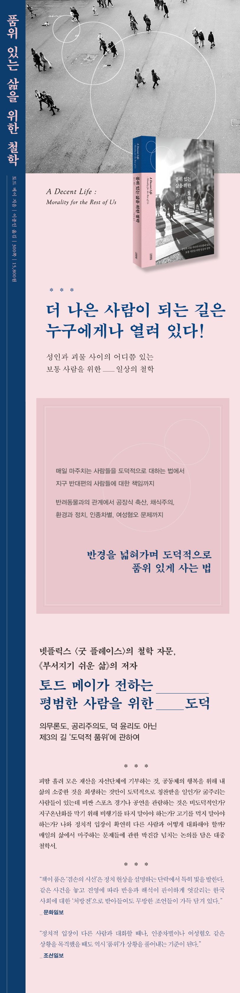 그렇다고우리가말하는‘더나은사람’이이타주의자나전통적도덕이론이요구하는것처럼한평생을착한일에바치고,가진재산의전부를기부하는등극단적인희생으로완벽한윤리를행하는도덕적성인은아니다.우리가그러한도덕적요구에완벽하게부응하며살아가기는어렵고,사실상불가능하다.미국철학자토드메이는《품위있는삶을위한철학》에서보통사람들에게소중한것을포기하지않으면서도일상에서실천할수있는‘품위decency’라는대안을제시한다.이책은이타주의에비하면다소소박한목적을가진삶,그렇지만도덕적평범함은벗어난생활을영위할수있는실천가능한방법을전한다.매일마주치는사람들을도덕적으로대하는법에서지구반대편의사람들에대한책임까지,반려동물과의관계에서채식주의,환경과정치,인종차별,여성혐오문제까지.반경을넓혀가며철학이론이나사회문제를다루면서도풍부한사례를들고,저자특유의유머와명석한통찰을더했다.