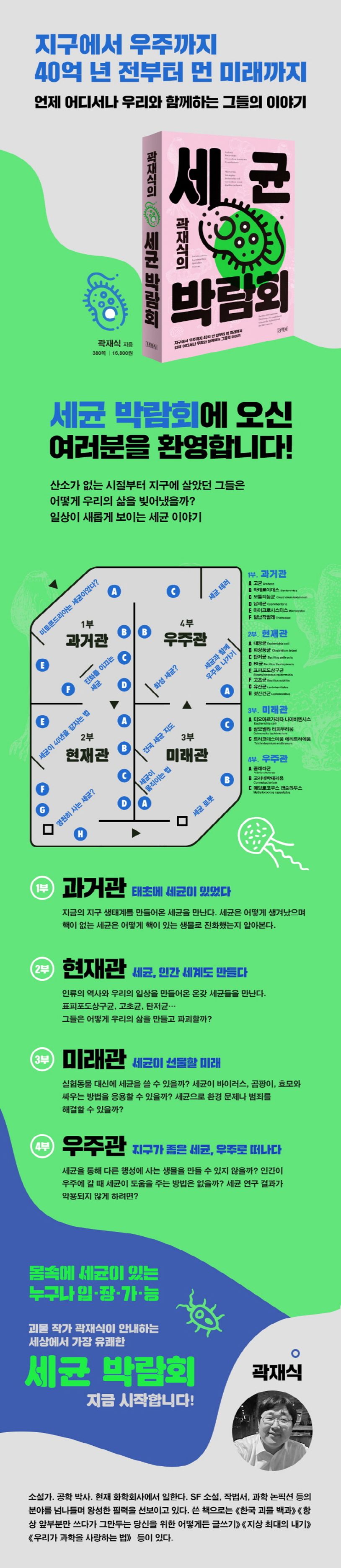 《한국 괴물 백과》, 《항상 앞부분만 쓰다가 그만두는 당신을 위한 어떻게든 글쓰기》, 《지상 최대의 내기》 등 SF 소설, 글쓰기, 과학 논픽션 등의 분야를 넘나들며 왕성한 필력을 선보이고 있는 ‘괴물 작가’ 곽재식의 신간. 이번에는 눈에 보이지 않지만 언제 어디서나 우리와 함께하는 존재, 인류가 등장하기 한참 전인 40억 년 전부터 지구에 나타나 지금 우리가 사는 자연적이고 인공적인 세계를 만들어온 세균을 소개한다. 가상의 박람회장은 과거관, 현재관, 미래관, 우주관으로 이루어져 있다. 독자들은 비유와 SF적 상상력이 넘치는 입담 좋은 저자의 안내를 받으며 즐겁게 세균의 세계로 떠날 수 있을 것이다.