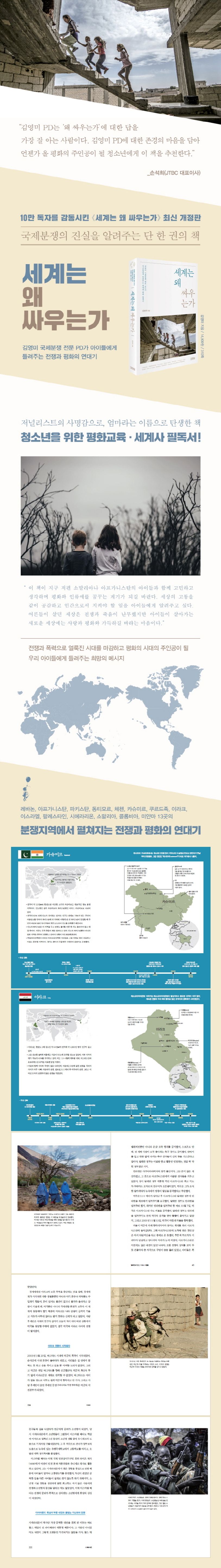 2011년 출간 후 8년간 세계는 아랍의 봄, IS의 출현 등 격변을 거듭했다. 최신개정판은 변화된 국제 정세에 맞게 내용을 수정하고 미군의 이라크, 아프가니스탄 철군, 미얀마 로힝야 사태 등 최신 현황을 보강했다. 또 억압의 상징이 된 부르카를 입은 여성, 탈레반과 소말리아 해적, 아프리카 소년병 등 각 분쟁지역의 정체성을 담은 컬러사진 20여 장을 추가했다. 저자는 증오와 폭력으로 얼룩진 분쟁의 참상을 조명하는 동시에 새로운 희망의 씨앗을 함께 보여준다. 아이들을 잃은 이스라엘과 팔레스타인의 엄마들이 장례식에서 서로를 위로하는 모습에서 우리는 분쟁의 종식은 어느 한쪽의 일방적 승리가 아닌 서로에 대한 이해와 인정을 통해서만이 비로소 가능함을 깨닫게 된다.