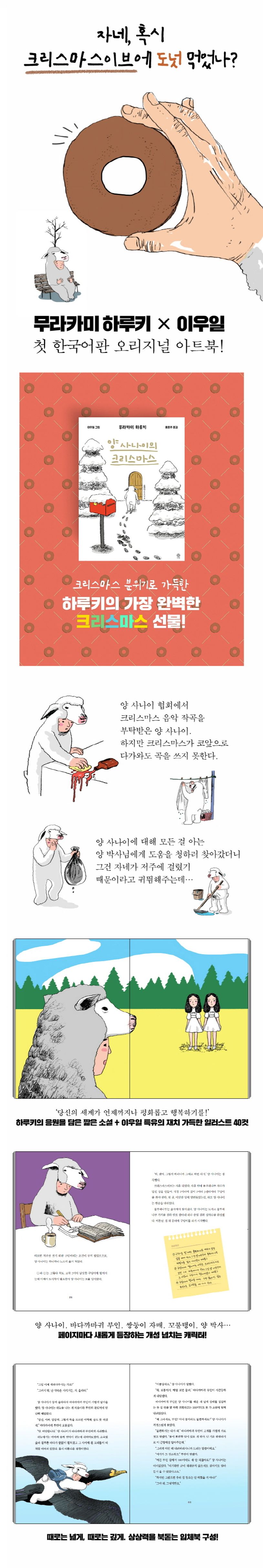 하루키 월드의 팬이라면, 크리스마스와 연말연시 책 선물을 찾는다면, 그리고 조금 특별한 그림책을 찾는다면 만나봐야 할 『양 사나이의 크리스마스』. 한국 일러스트레이터와의 첫 협업으로 특별함을 더하는 무라카미 하루키의 크리스마스 선물로, 평화와 행복을 비는 응원을 담은 짧은 소설과 이우일의 재치 넘치는 40여 컷의 그림으로 완성된 이야기가 때로는 넓게, 때로는 깊게 확장되는 입체 페이지로 하루키 월드로의 여행을 환상적으로 안내한다.