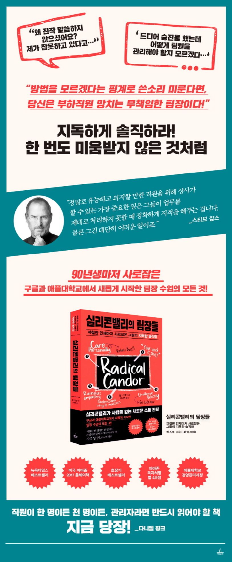 8년 동안 구글에서 직원 700명을 관리하고, 애플대학교로 건너가 관리자 교육과정을 개발한 킴 스콧이 실리콘밸리의 새로운 리더들 사이에서 널리 퍼지고 있는 새로운 소통 방식을 모두 정리한 『실리콘밸리의 팀장들』. 보통의 직장인은 경력을 쌓아가며 자연스레 직급을 얻거나, 또는 회사 규정에 따라 시험까지 보면서 승진을 한다. 그러나 승진과 동시에 생각지 못한 문제를 마주하고 당황한다. 드디어 승진을 했는데 어떻게 팀원을 대해야 할지 모르겠다!