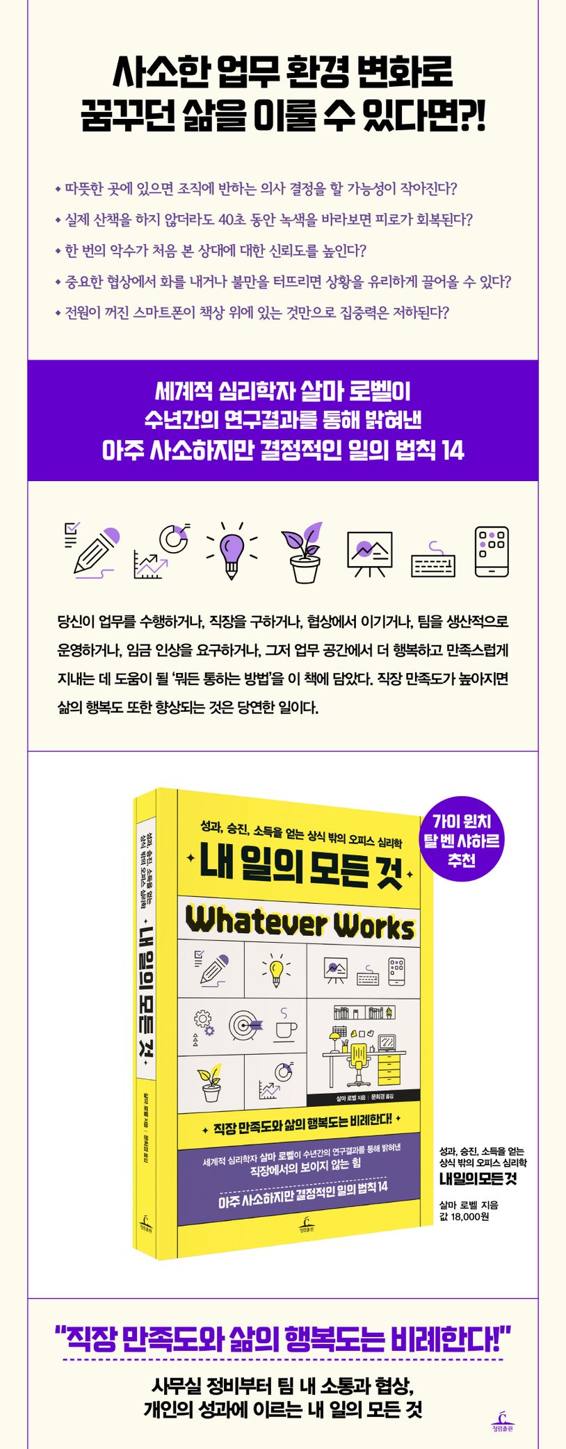 이것들은 매일 우리의 행동에 영향을 미치고 직장에서의 성공 또는 실패에 실질적이고 중요한 역할을 하는 보이지 않는 요소다. 이 책에는 당신이 업무를 수행하거나, 직장을 구하거나, 협상에서 이기거나, 팀을 생산적으로 운영하거나, 임금 인상을 요구하거나, 그저 업무 공간에서 더 행복하고 만족스럽게 지내는 데 도움이 될 ‘뭐든 통하는 방법’을 담았다. 직장 만족도가 높아지면 삶의 행복도 또한 향상되는 것은 당연한 일이다.