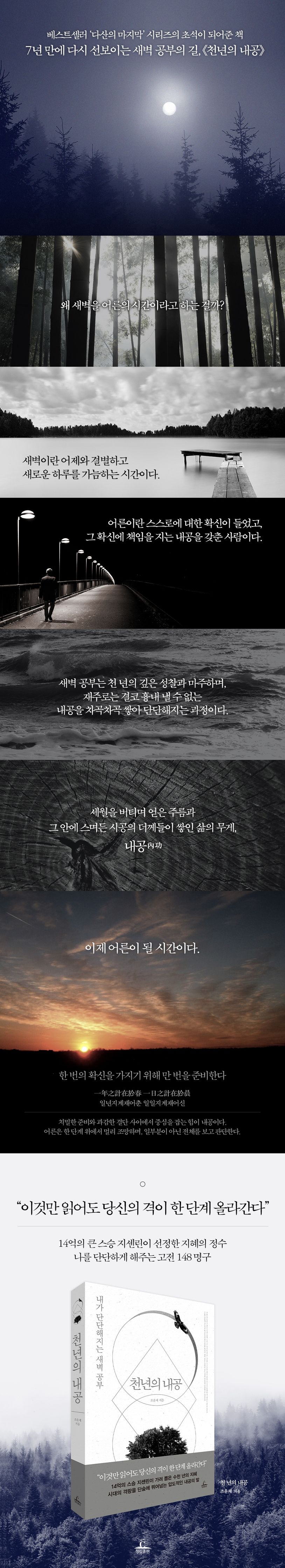 7년 전 내공 있는 어른으로 성장하기 위한 ‘새벽 공부’를 제시했던 《천년의 내공》이, 2023년 새로운 표지와 본문으로 갈음하여 매일의 격랑을 거뜬히 이겨내는 삶의 길로 안내한다.