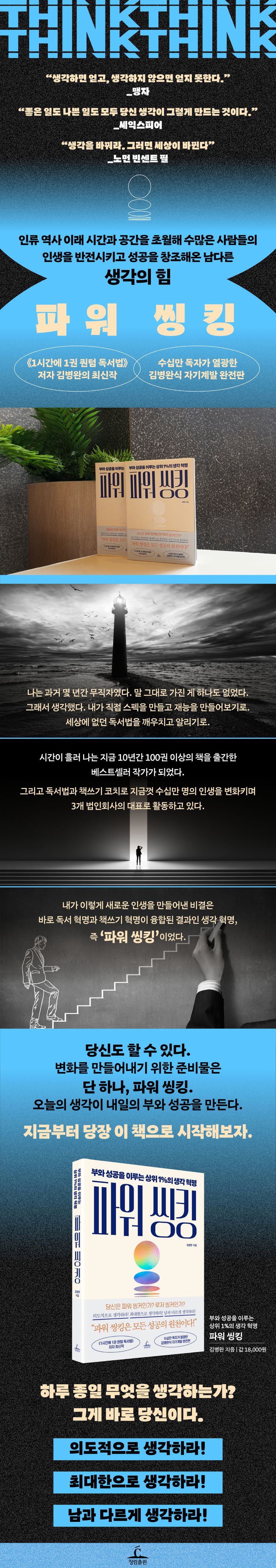 지금 당신, 돈이 없는가? 재능이 없는가? 학벌도, 스펙도, 체력도 부족한가? 이미 늦었다고 생각하고 있지는 않은가? 이번 생은 망했다며 모든 것을 내려놓은 채 방구석에 앉아서 하루하루 무의미한 시간을 보내고 있다면 당신은 반드시 평생 실패한 삶을 살 것이다. 그러나 오직 생각의 관점만 바꾼다면, 평범한 당신도 위대한 성공을 이룰 수 있다. 여기 수십만 독자의 인생을 바꾼 《1시간에 1권 퀀텀 독서법》의 김병완 저자가 새로운 성공의 자본을 제시한다. 독서와 책쓰기를 뛰어넘어 인생을 반전시키고 성공을 창조하는 남다른 생각의 힘, 바로 ‘파워 씽킹’이다. 미래는 꿈꾸는 자의 것이 아니라 생각하는 자의 것이다. 지금 바로 파워 씽킹하라! 생각을 바꾸면 세상이 바뀐다.