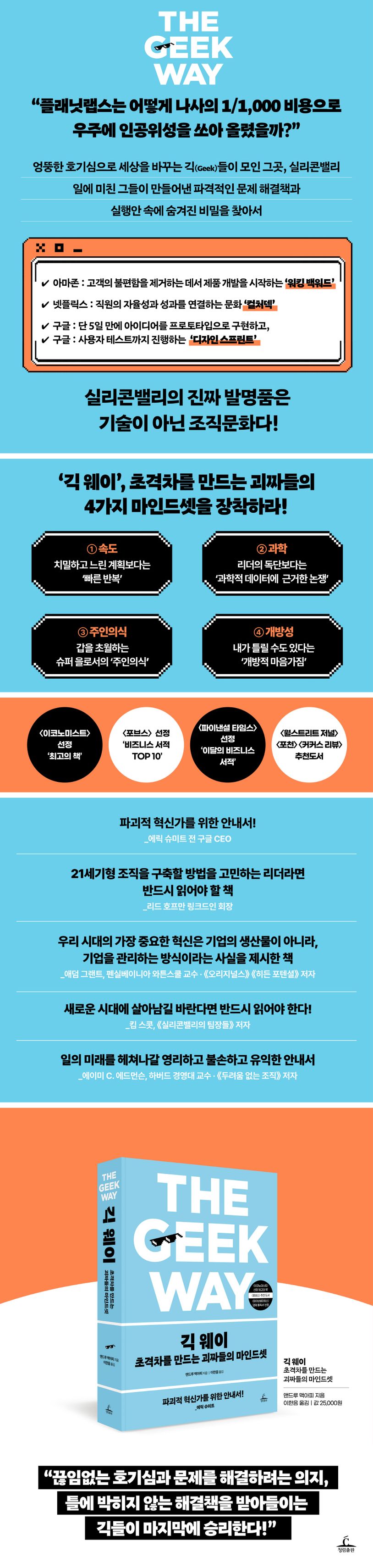 저자는이런엉뚱한호기심이야말로‘긱(Geek)’을정의하는대표적인요소라고말한다.자신이어린시절부터긱이었다는고백과함께시작하는이책은긱에대한솔직담백한정의부터이들이세상을살아가는방식,더나아가긱들이모인조직이세상을바꾸는법까지광활한내용을지면에담고있다.저자가말하는긱이란호기심을멈추지않고,어려운문제와씨름하는것을두려워하지않으며,관행에어긋나는해결책을받아들이는사람이다.저자는세상을바꾼혁신기업들에는이런긱들이모여있었다고주장하며,실리콘밸리의리더들로인식되는긱들이어떻게새로운조직문화를구축해왔는지우리에게널리알려진다양한사례를통해자세히보여주고있다.