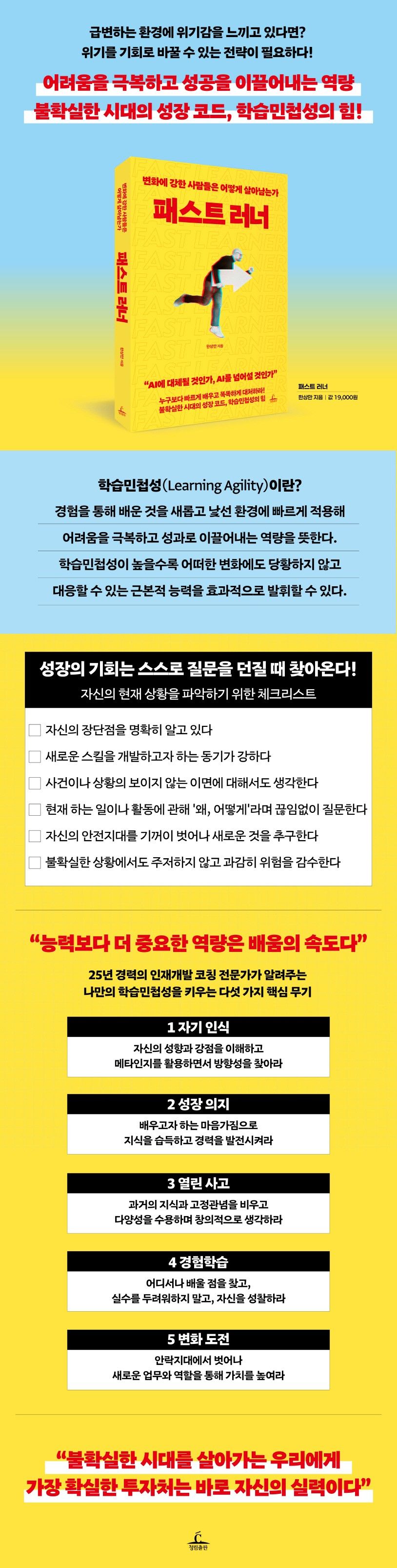 세상이 빠르게 변하고 있다. 특히 챗GPT와 같은 생성형 AI 기술의 발달로 향후 10년 이내에는 초지능 시대가 도래할 것이며, 로봇이 인간을 대체하는 미래가 펼쳐질 것이란 전망도 더는 허황된 이야기가 아니다. 막연히 미래에는 AI에 내 일자리가 대체되는 것은 아닌지 두려워하고 있을 시간이 없다. 빠르게 변하는 세상에 민첩하게 적응하고, 자신만의 핵심 역량을 갖춘 ‘패스트 러너(Fast Learner)’가 되어 불확실한 세상의 변화에 대응해야 한다. ‘학습민첩성(Learning Agility)’은 낯선 환경에서 어려움을 극복하고 성공을 이끌어내는 역량을 뜻하며, 인재개발과 기업 경영 분야에서 널리 활용되고 있는 개념이다. 학습민첩성이 높은 사람은 업무 성과가 높고, 승진을 빨리 하며, 미래의 리더와 전문가로 성장할 수 있는 가능성이 크다. 그러므로 패스트 러너가 되기 위해서는 학습민첩성을 적재적소에 활용하면서 누구보다 빠르게 성장해야 한다.