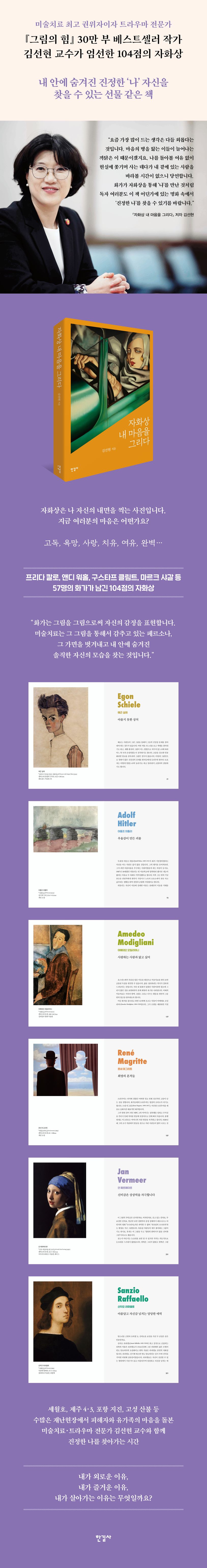 자화상은 자신의 내면을 솔직하게 드러내는 강력한 비언어적 표현 도구로서 마음을 찍는 사진이다. 그런 의미에서 자화상을 감상하는 가장 큰 목적은 제3자의 삶을 간접적으로 경험할 수 있기 떄문이다. 이 책은 내 마음의 페르소나, 그 가면을 벗겨내고 내 안에 숨겨진 진정한 ‘나’를 만나는 시간이 될 것이다.