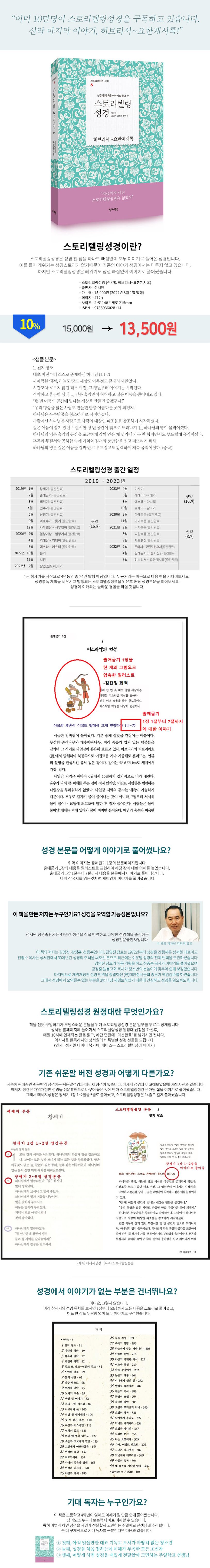 성서원의스토리텔링성경은예로부터사람들에게가장친숙한‘이야기형태’로아주쉽게성경의내용을잘이해할수있도록만들었다.성경내용을간추리거나주요내용을발췌한요약성경이아니다.심지어성경의병행본문까지도일절생략함없이매장,매절을따라가면서주석과해설을곁들여이야기로풀어,성경의메시지를친절하고재미있게독자에게전달해주는“확대된성경”이다.스토리텔링성경은이야기를비롯해서주석과해설의기능까지함께하느라,본래의성경본문보다2-4배정도많은분량인것을확인할수있다.하나의예를들면쉬운말성경의본문을기준으로해서“요셉과그형제들이야기”(창37-50장)는그분량이200자원고지로200매다.그런데스토리텔링성경에서는무려500매로,2.5배가된다.이처럼분량이늘어난것은스토리텔링성경에서는이야기꾼이성경본문에대한객관적인설명뿐만아니라,본문을읽은뒤경건하고거룩한묵상을통해말씀에대한자신의응답을고백적으로진술하는부분이적지않기때문이다.저자의이런감동이독자의감동과서로만날때,독자는삶이한층풍요로워지는말씀나눔의체험을할수있게된다.따라서성경을이해함에있어서성경본문을이해하지못하고그냥10번읽는것보다스토리텔링성경을한번정독하는것이훨씬낫다.