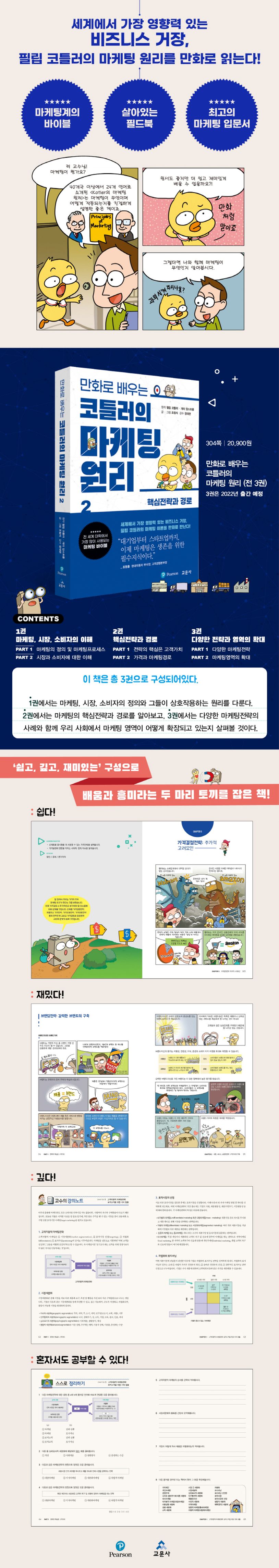 1권 ‘마케팅, 시장, 소비자의 이해’에 이어, 2권 ‘핵심전략과 경로’가 출간되었다. 주요 등장인물은 마케팅 전공 교수 ‘리원’, 학부생 ‘삐약’, 조교 ‘멍군’과 취재원 ‘시리포터’이다. 이들이 한데 모여 목표고객을 위해 가치를 만들고 전달하는 ‘마케팅의 핵심전략’과 ‘마케팅경로’에 관해 묻고 대답하며 답을 찾아가는 과정이 펼쳐진다. 모든 이야기는 만화가 조립식의 손을 통해 통통 튀는 선과 선명한 색채, 재치 있는 대화로 표현된다.