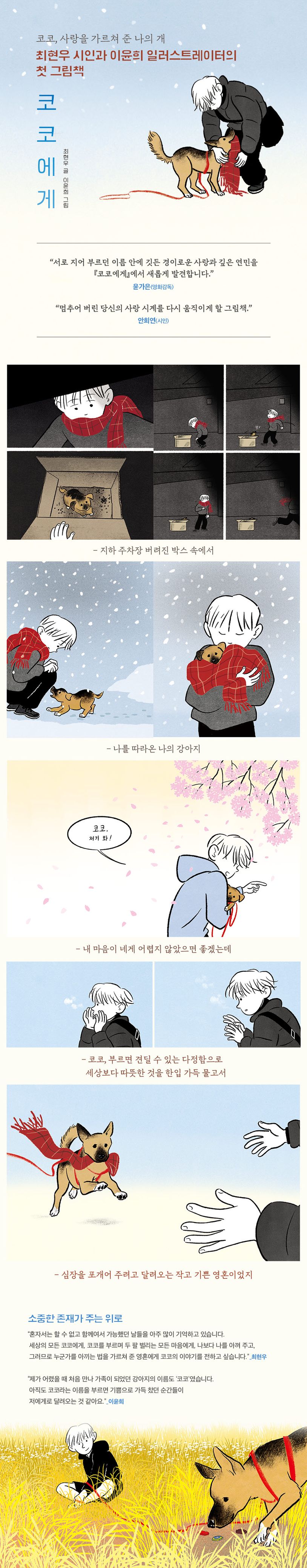 최현우 시인과 이윤희 일러스트레이터의 첫 번째 그림책 『코코에게』가 출간되었다. 반려동물과 함께하는 눈부신 나날을 그린 최현우 시인의 시 「코코, 하고 불렀습니다」를 온 세대가 함께 감상하는 그림책으로 새롭게 선보인다. 슬플 때나 기쁠 때나 곁을 내어 주는 강아지 ‘코코’ 덕분에 아이가 밝은 세상을 발견하는 모습이 뭉클하게 펼쳐진다. 독자는 소중한 존재와 주고받는 위로와 기쁨을 느끼고, 기억 저편에 있던 다정한 순간 또한 떠올릴 수 있을 것이다.