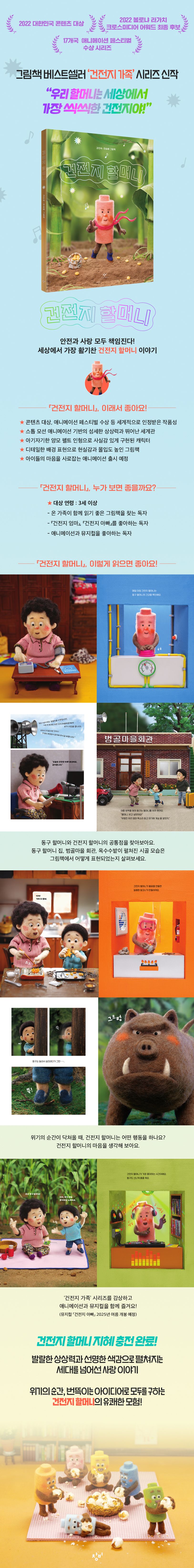 섬세한 손끝에서 사랑스러운 세계를 만들어 내는 강인숙·전승배 작가의 입체 촬영 그림책 『건전지 할머니』가 출간되었다. 가족 간의 사랑과 생활 속 안전 지침을 재치 있게 결합한 이야기로 어린이 독자의 사랑을 받은 ‘건전지 가족’ 시리즈 신작이다. 전작 『건전지 아빠』 『건전지 엄마』의 원작 애니메이션은 17개국 애니메이션 페스티벌에서 수상하며 세계적으로 주목받았으며, ‘대한민국 콘텐츠 대상’을 수상하고, 볼로냐 라가치 크로스미디어 어워드 최종 후보작으로 선정되는 등 빛나는 성취를 이루었다. 『건전지 할머니』는 번뜩이는 재치로 손주를 위험에서 구하는 ‘건전지 할머니’의 활약을 그리며, 야생 동물과의 공생 주제를 함께 다룬다. 사랑으로 충전하는 결말이 따스한 여운을 남기는 가족 그림책이다.